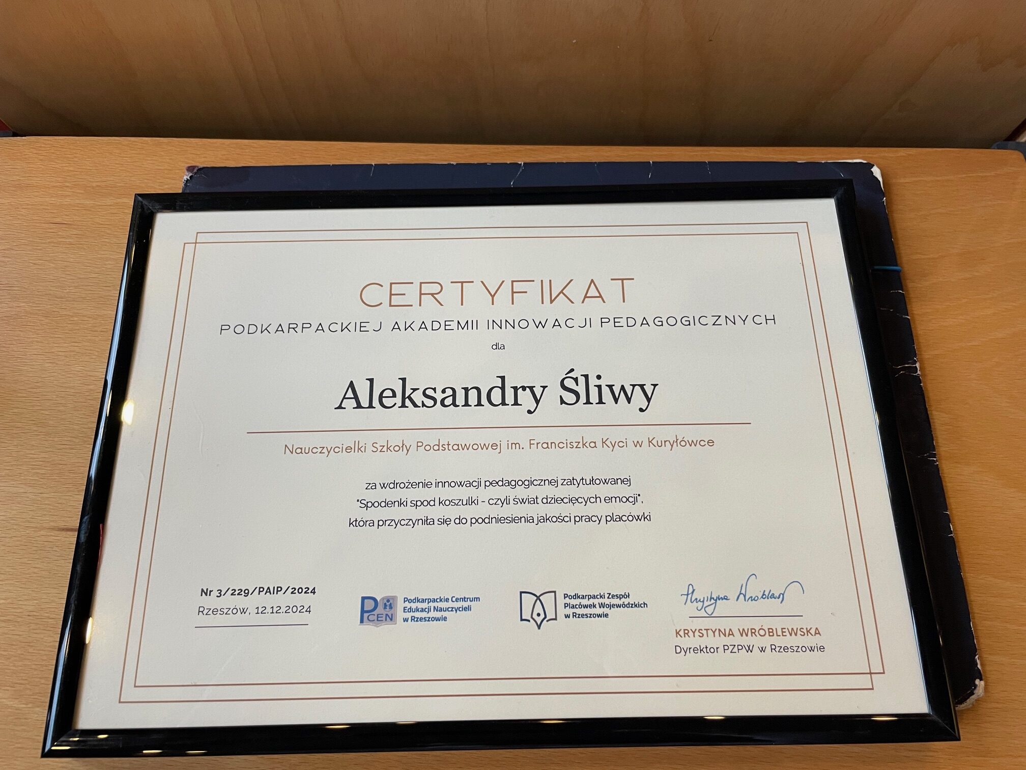 - Certyfikat Podkarpackiej Akademii Innowacji Pedagogicznych – nagroda dla nauczycieli za wdrażanie w przedszkolach i szkołach nowatorskich rozwiązań edukacyjnych, nadających nowy wymiar pracy dydaktycznej.