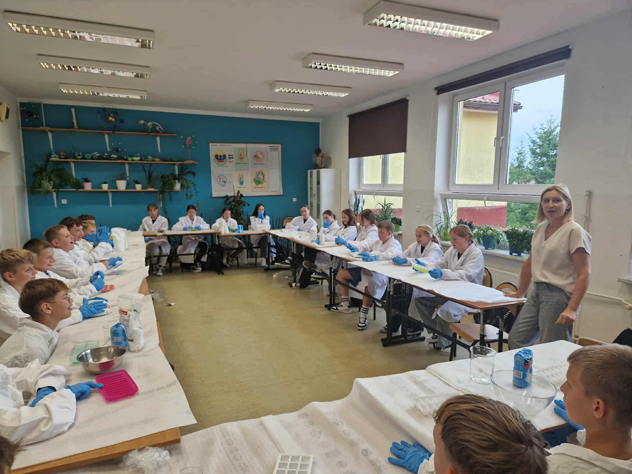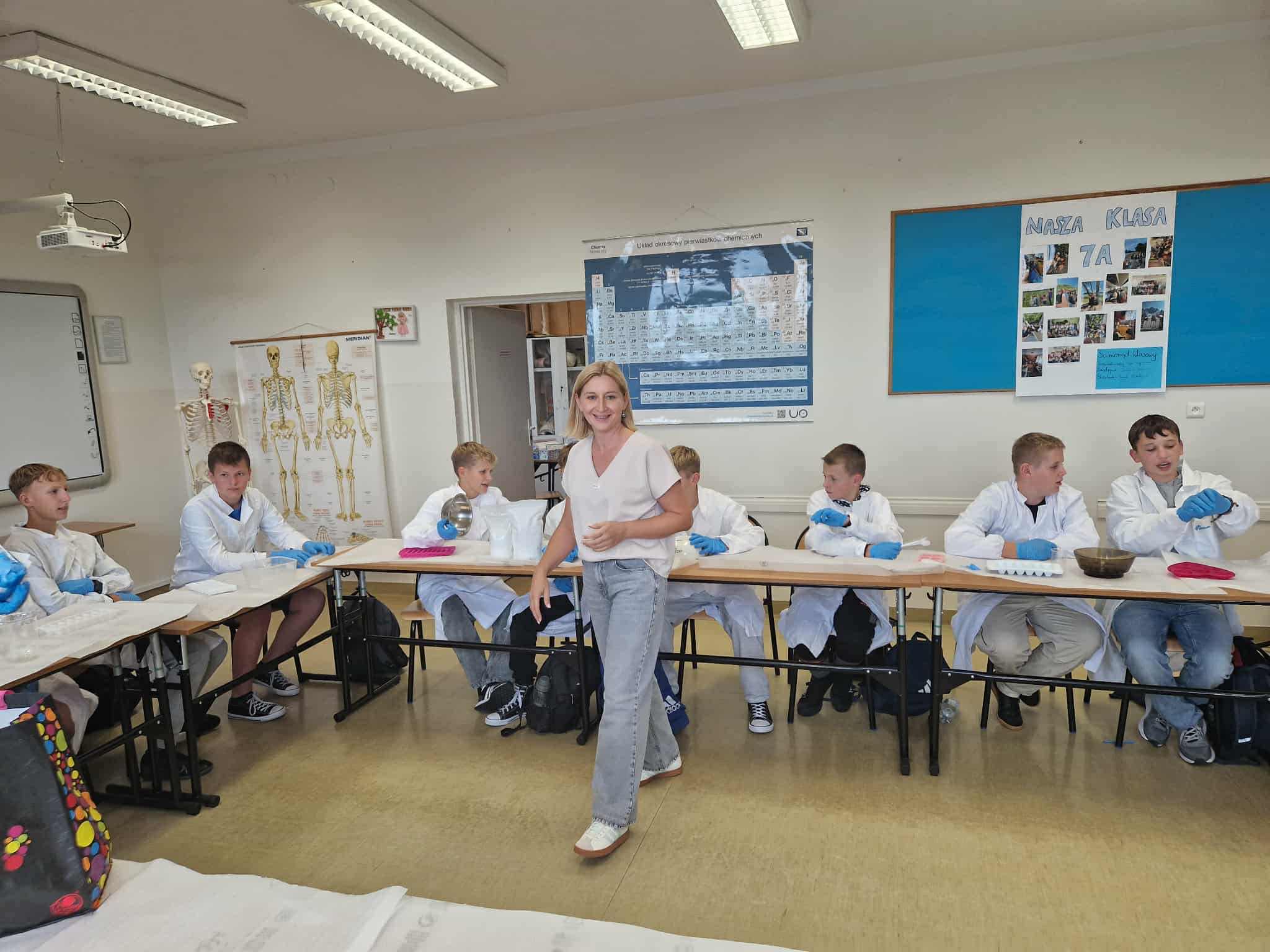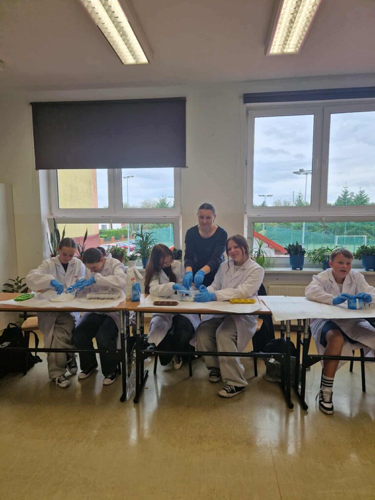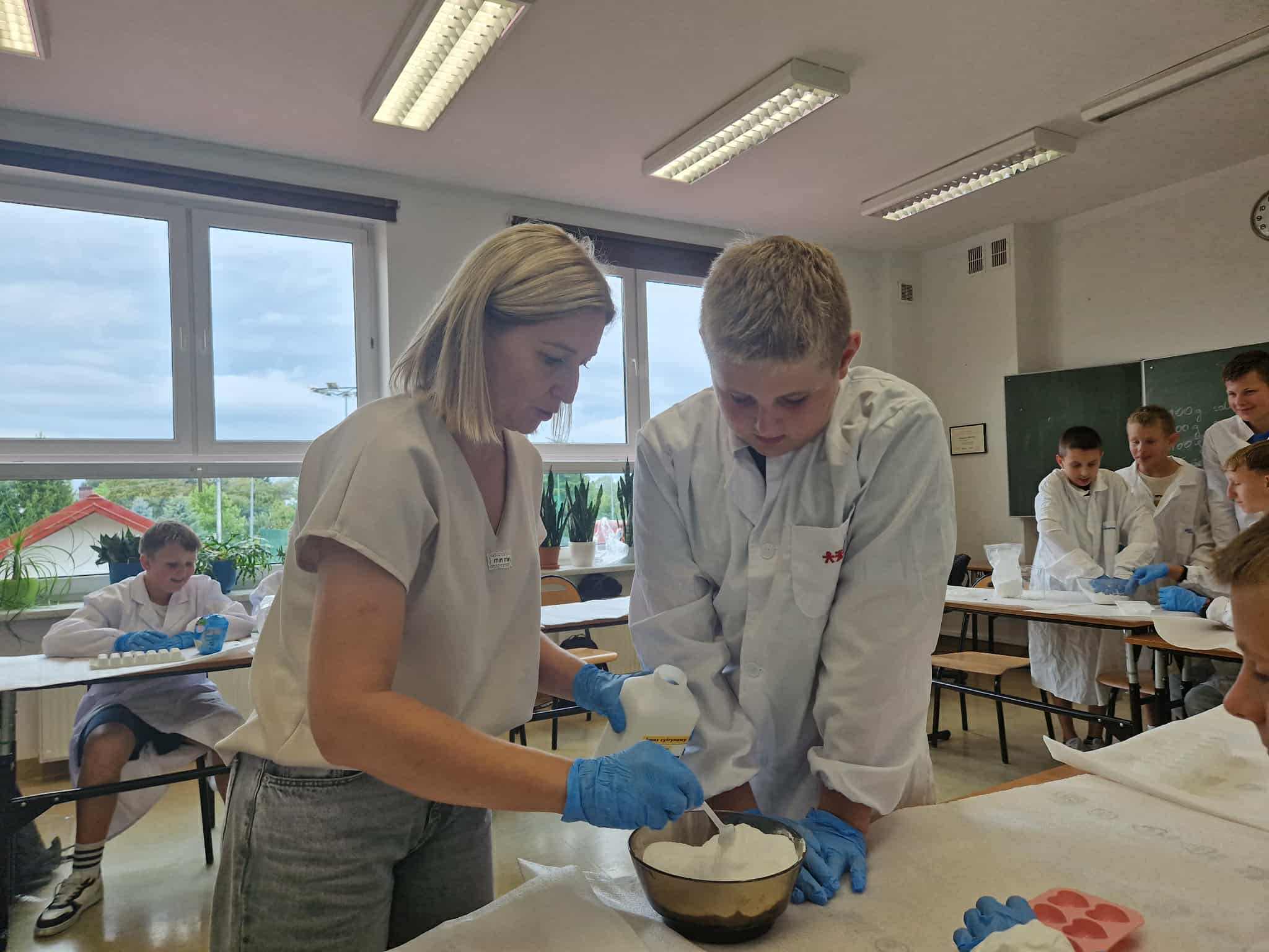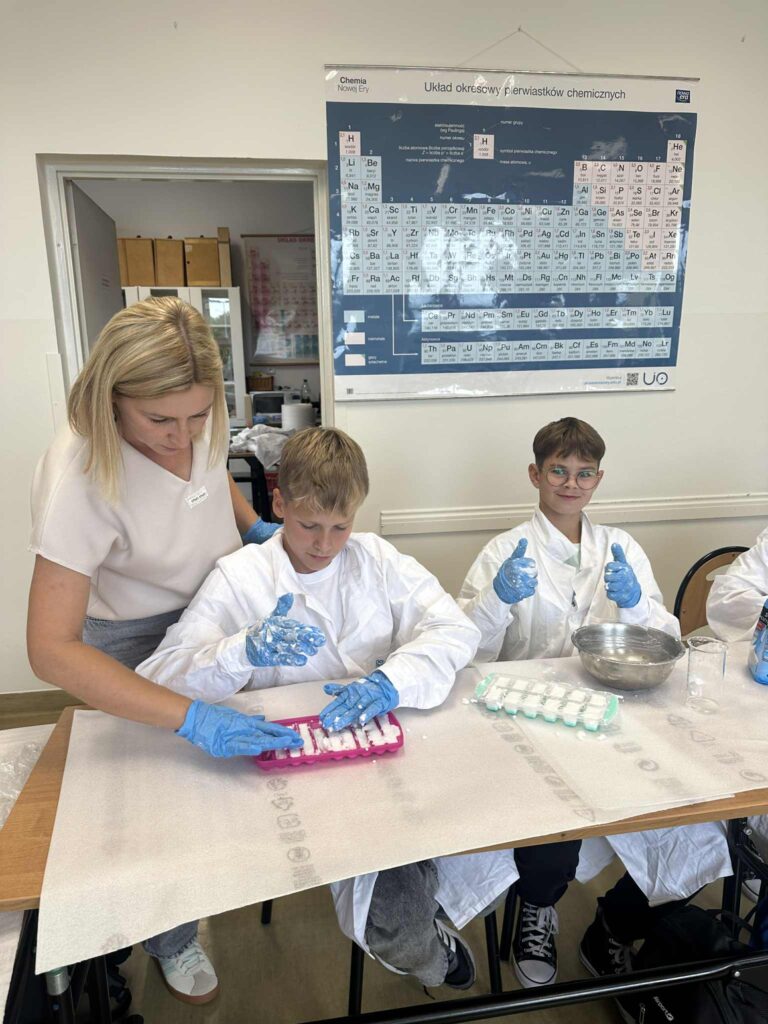 promowanie postaw proekologicznych w codziennym życiu. Tego dnia zwykła sala lekcyjna zamieniła się w prawdziwe laboratorium. Uczniowie, wyposażeni w ochronne fartuchy i rękawiczki, z zapałem przystąpili do działania. Prowadząca warsztaty, pani Katarzyna Stawowy, na początku zajęć przypomniała o zasadach bezpieczeństwa i higieny pracy, a następnie przedstawiła szczegółową instrukcję oraz harmonogram poszczególnych etapów warsztatów. Po wprowadzeniu teoretycznym