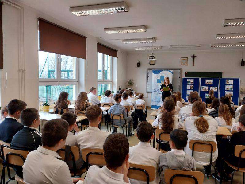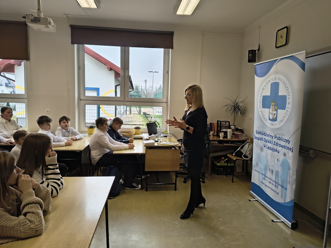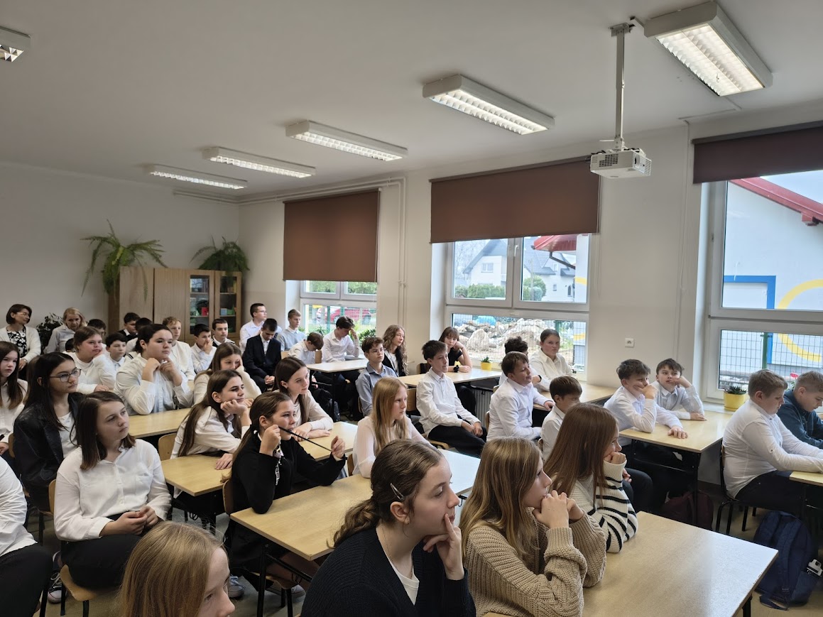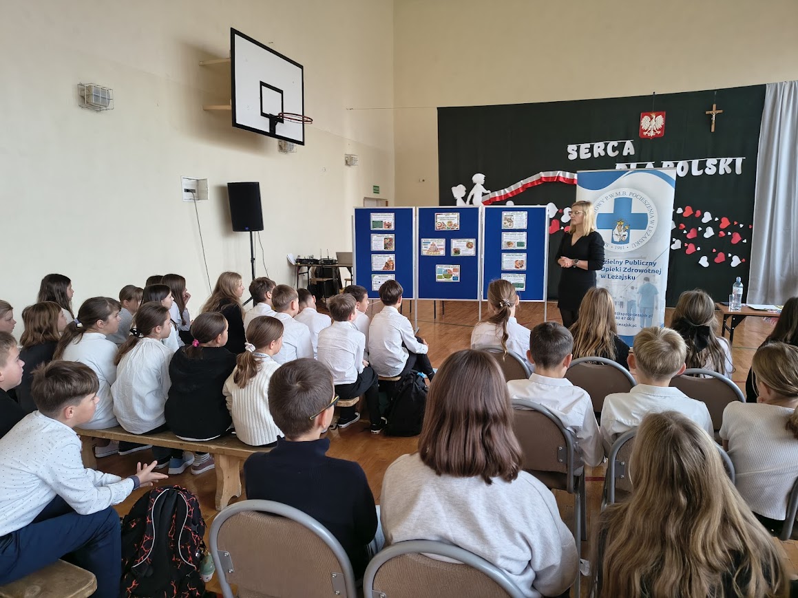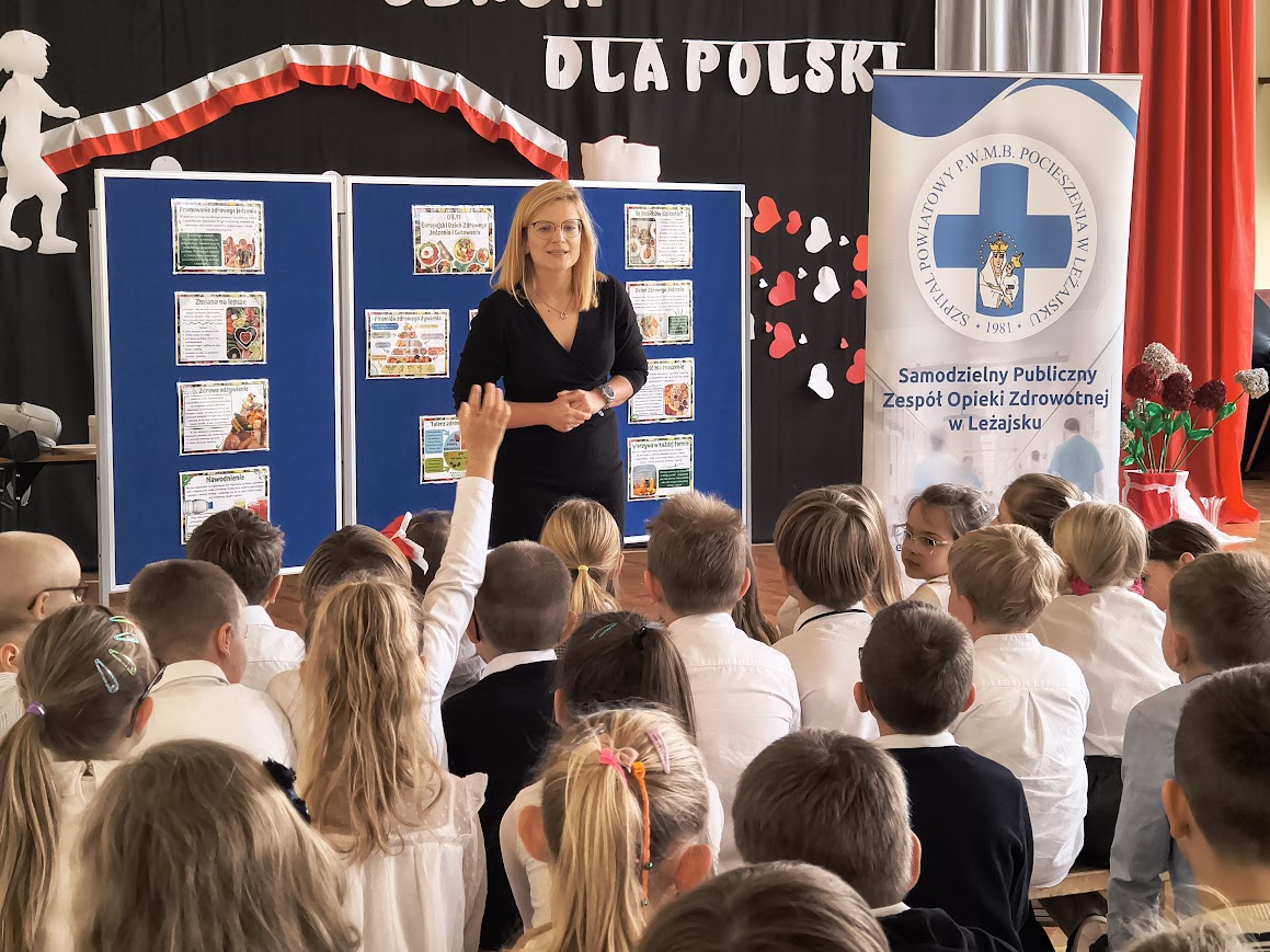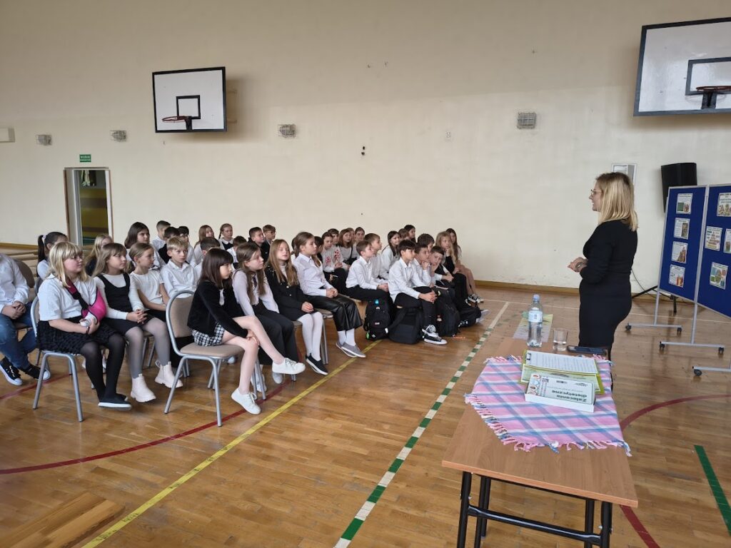 Z okazji Europejskiego Dnia Zdrowego Żywienia i Gotowania, który obchodzony jest 8 listopada, w naszej szkole odbyło się spotkanie z panią Moniką Kozioł, która jest dietetykiem w Poradni Dietetycznej w Samodzielnym Publicznym Zespole Opieki Zdrowotnej w Leżajsku. Celem wydarzenia było uświadomienie uczniom, jak ważne jest zdrowe odżywianie i właściwe nawyki żywieniowe w codziennym życiu. Podczas spotkania pani dietetyk opowiadała o tym, jak powinien wyglądać zbilansowany jadłospis, ile posiłków dziennie warto spożywać oraz dlaczego warto ograniczyć słodycze i napoje gazowane. Uczniowie dowiedzieli się również, jakie produkty dostarczają energii do nauki oraz jak czytać etykiety na opakowaniach żywności. Nie zabrakło też praktycznych porad i ciekawostek – dzieci i młodzież z klas 1-8 zastanawiali się wspólnie z dietetykiem jak przygotować zdrowe i smaczne przekąski oraz drugie śniadanie do szkoły. Na zakończenie spotkania odbył się mini quiz o zdrowym odżywianiu.