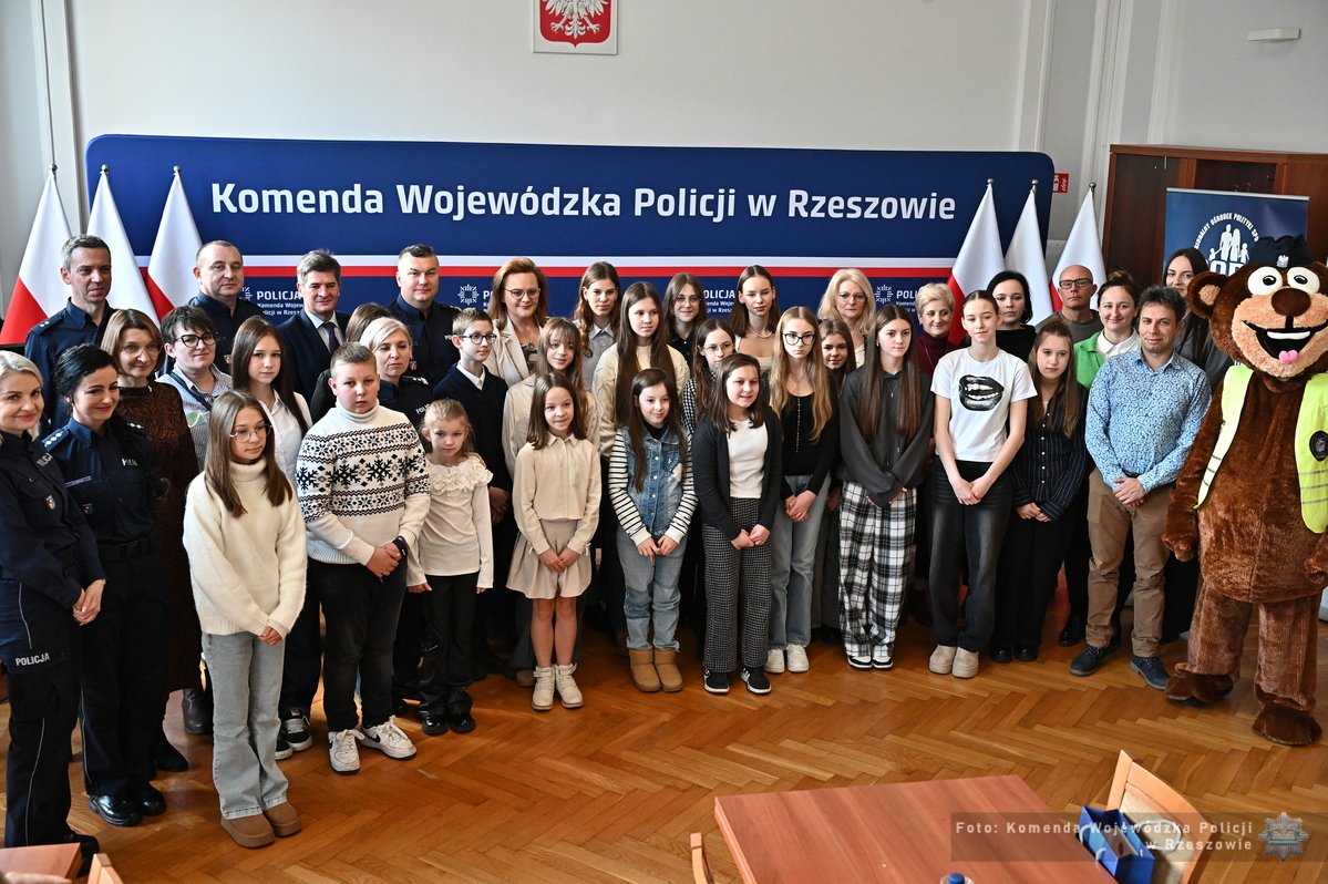 Dnia 4 grudnia w Wojewódzkiej Komendzie Policji w Rzeszowie odbyło się uroczyste wręczenie nagród w finale wojewódzkiego konkursu plastycznego „Bezpieczne wakacje 2025”. Z radością i dumą informujemy, że uczennica naszej szkoły Lena Mazurek z kl. 7a zajęła tam II miejsce. Jej praca została nagrodzona w eliminacjach powiatowych, a następnie była jedną spośród 230 prac, które wpłynęły na konkurs z całego województwa. Tym bardziej cieszy fakt, że mimo tak dużej liczby zgłoszeń właśnie praca naszej uczennicy znalazła się na podium. Serdecznie gratulujemy sukcesu i życzymy dalszych inspiracji oraz rozwijania artystycznej pasji!