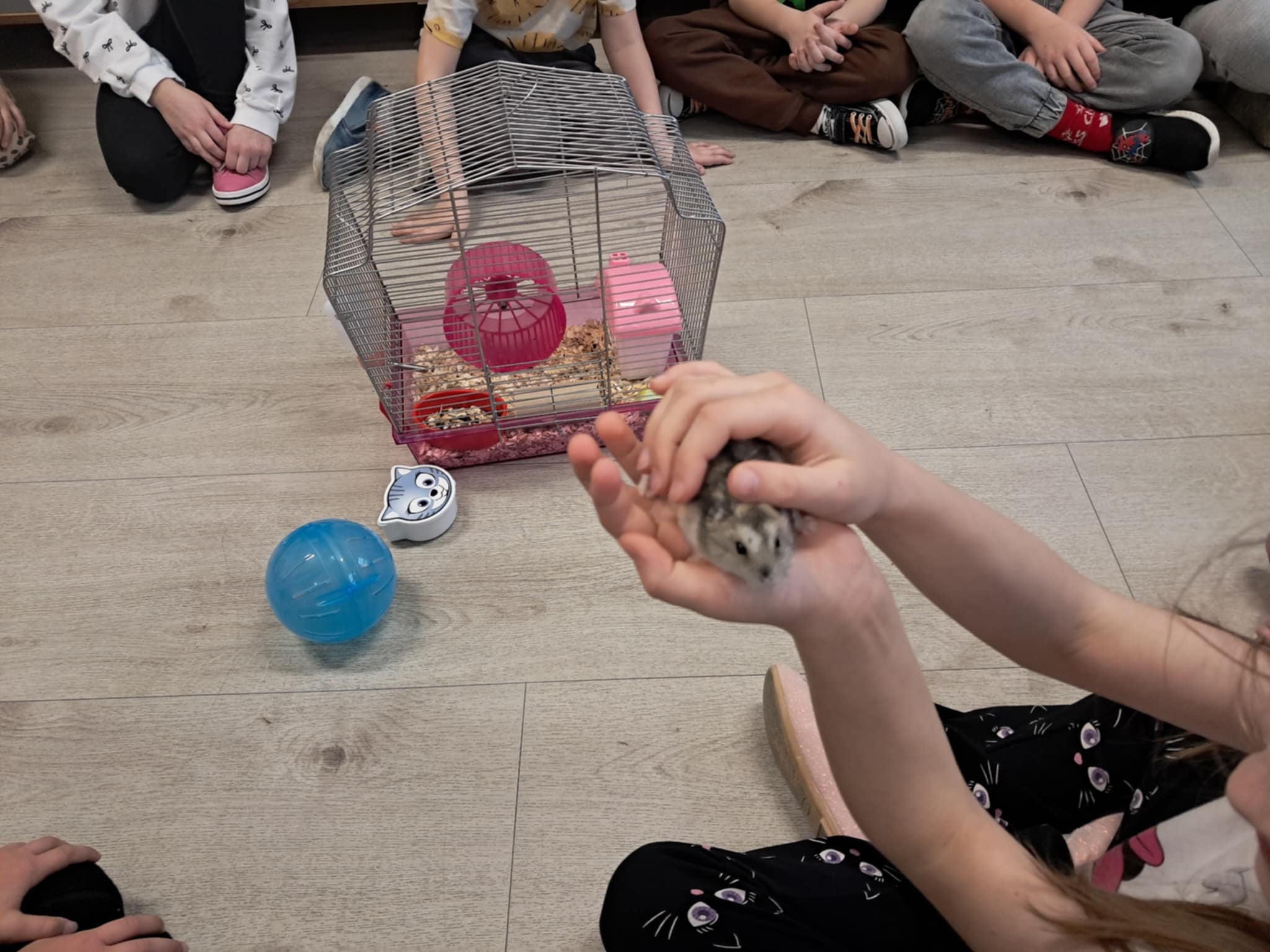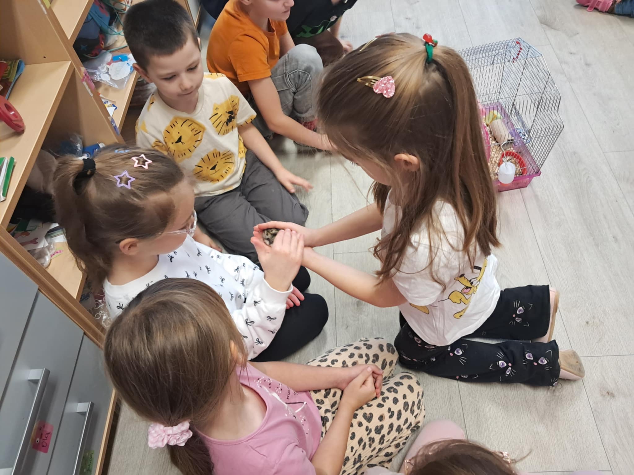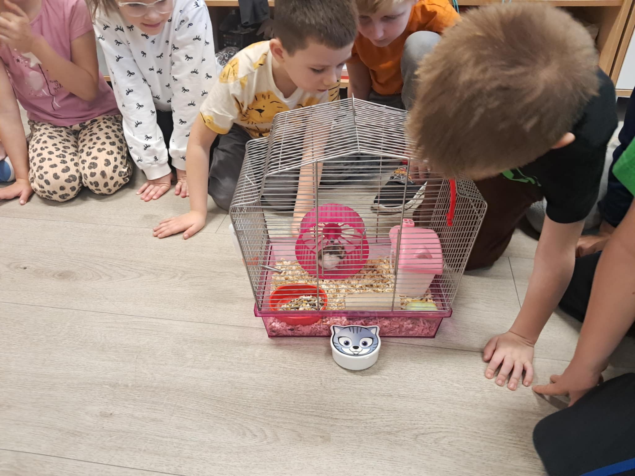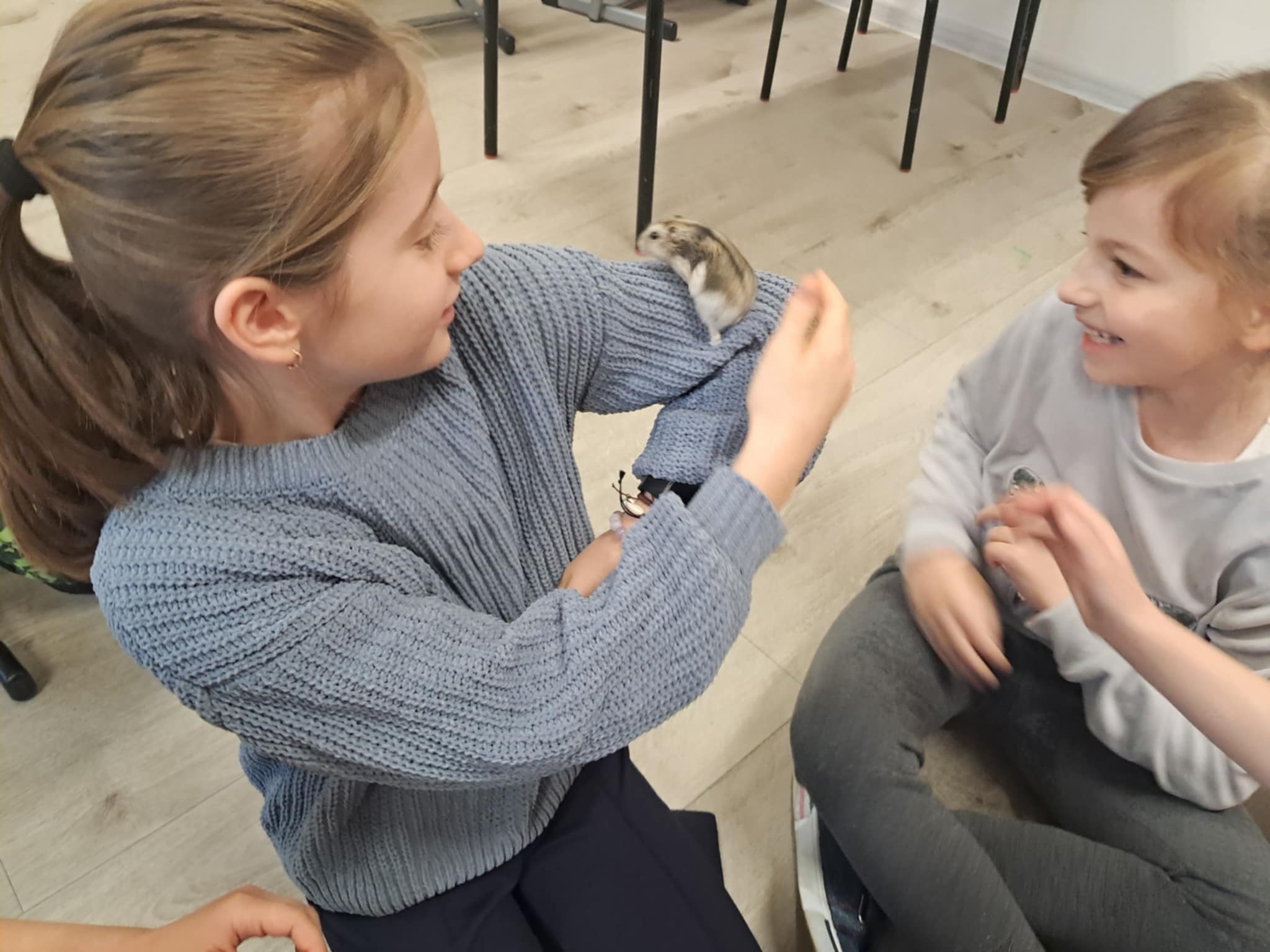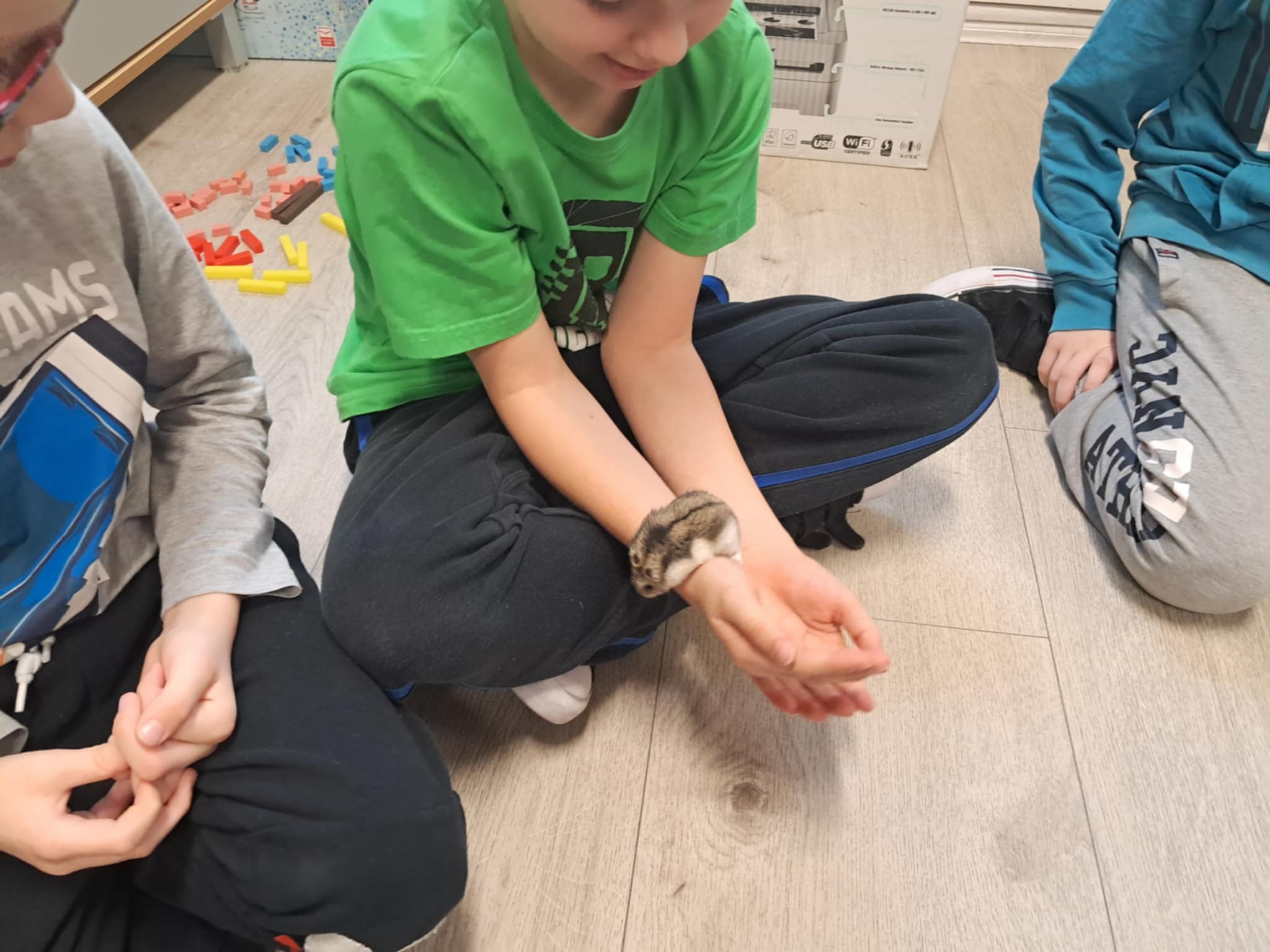 W klasie 1 odbyła się wyjątkowa lekcja, podczas której uczniowie poznali małego, puszystego gościa – chomika o imieniu Iskierka. Spotkanie było częścią zajęć o zwierzętach domowych i wzbudziło wśród dzieci ogromne zainteresowanie. Już na początku uczniowie przypomnieli sobie zasady bezpiecznego zachowania przy zwierzętach: cicho mówimy, nie dotykamy bez zgody i dbamy o spokój małego przyjaciela. Gdy chomik pojawił się w sali, dzieci z zapartym tchem obserwowały, jak ostrożnie wygląda ze swojego domku i rusza wąsikami, badając nowe otoczenie. Podczas zajęć pierwszoklasiści poznali ciekawostki o życiu chomików: dowiedzieli się, co jedzą, kiedy są najbardziej aktywne oraz dlaczego chowają jedzenie w policzkach. Uczniowie wykonali także zadania edukacyjne oraz zrobili chomika z papieru. Najważniejszym celem lekcji było jednak budowanie empatii i odpowiedzialności. Spotkanie z Iskierką przyniosło wiele radości i stało się inspirującą lekcją o świecie zwierząt. To wydarzenie na długo pozostanie w pamięci pierwszoklasistów!