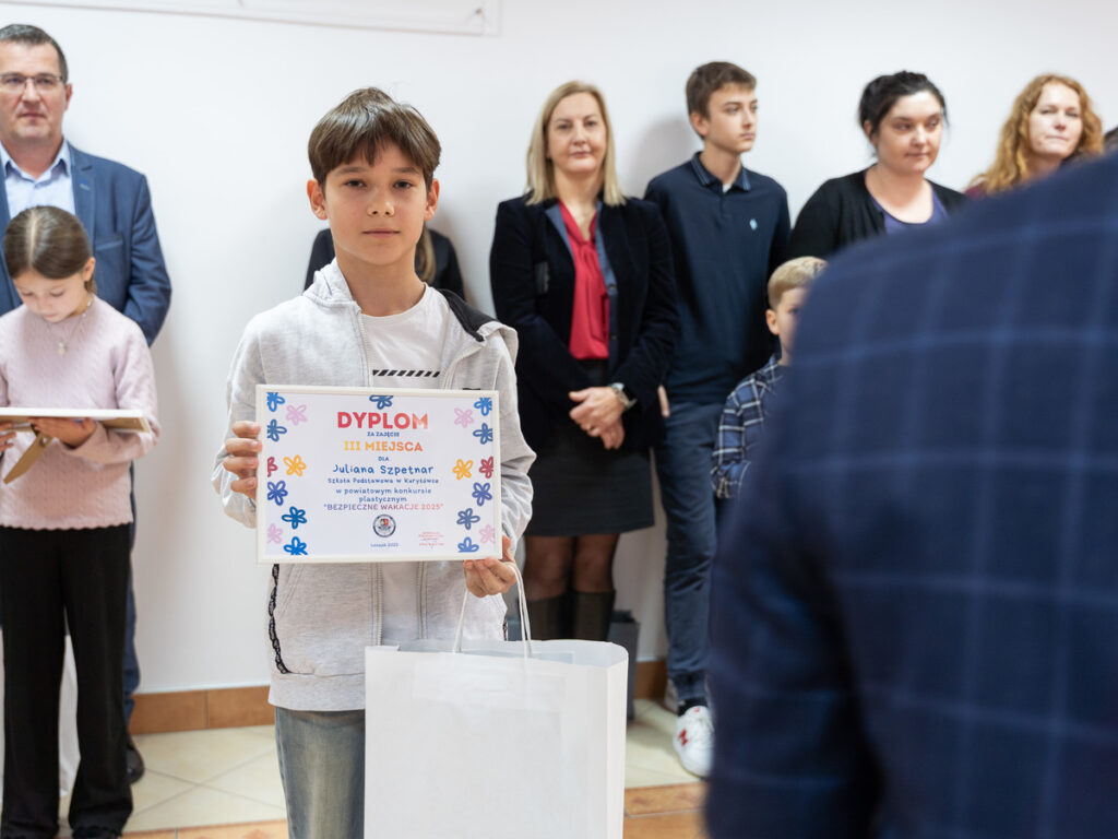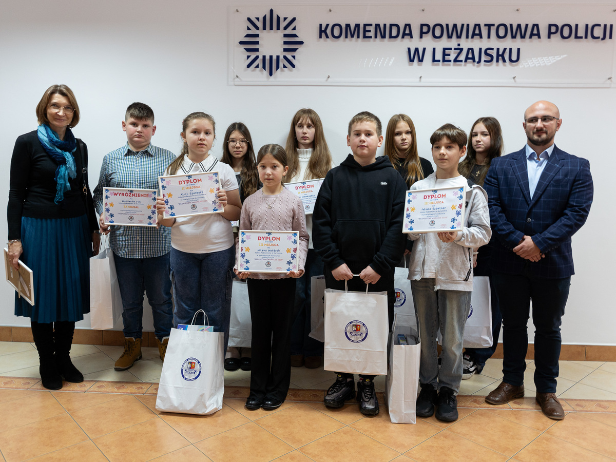 27 listopada 2025 roku w Komendzie Powiatowej Policji w Leżajsku miało miejsce uroczyste podsumowanie Powiatowego Konkursu Plastycznego pod hasłem „Bezpieczne wakacje 2025”. W wydarzeniu uczestniczyli młodzi artyści z różnych szkół naszego powiatu, których prace zostały wysoko ocenione za kreatywność, estetyczne wykonanie oraz umiejętne ukazanie tematyki bezpieczeństwa podczas wakacji. Z radością informujemy, że w gronie nagrodzonych znalazło się aż dziewięcioro uczniów naszej szkoły. Ich prace zwróciły uwagę komisji konkursowej dojrzałym spojrzeniem na zagadnienie bezpieczeństwa, oryginalnym ujęciem tematu oraz wysokimi walorami artystycznymi.