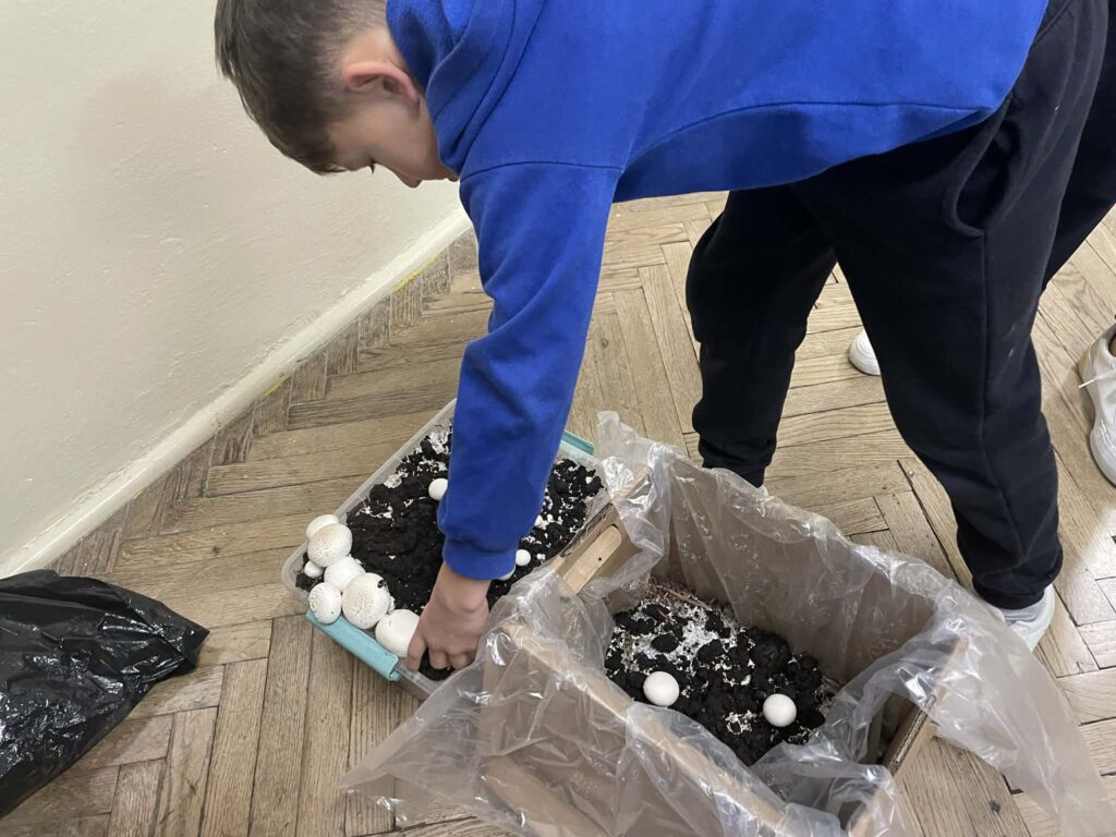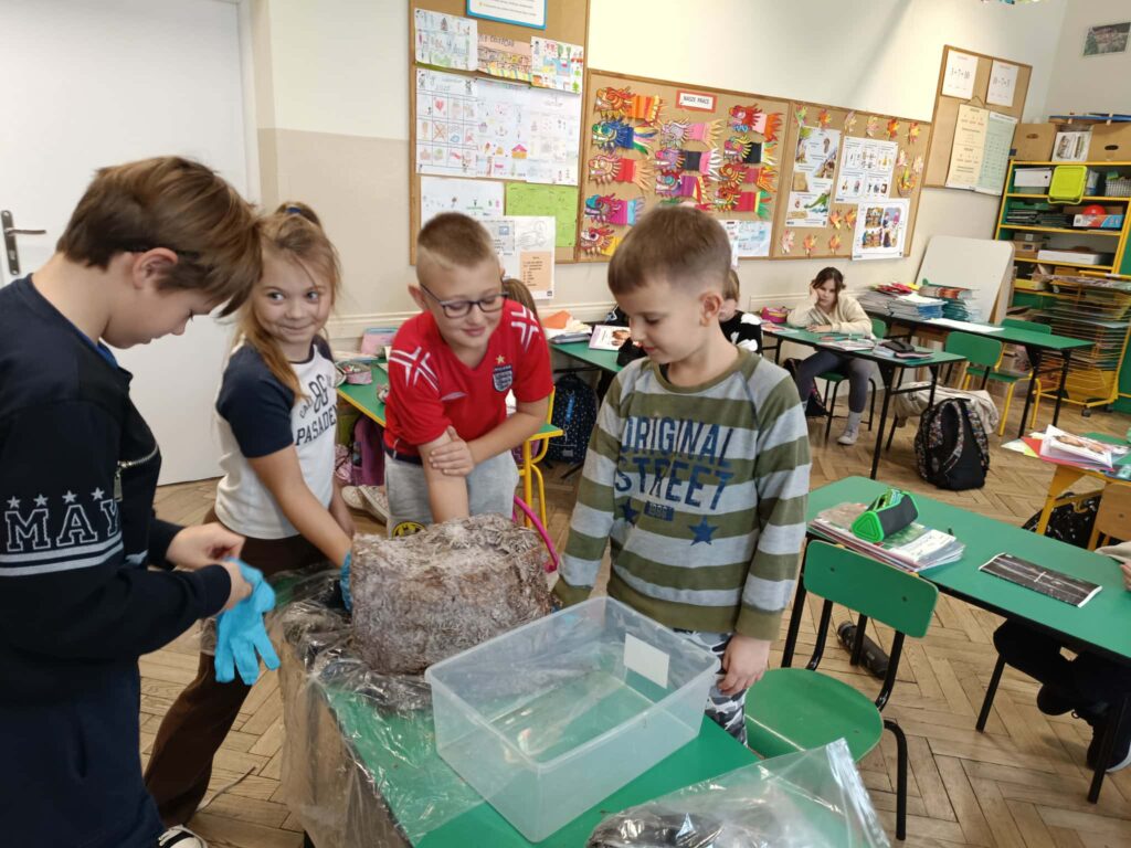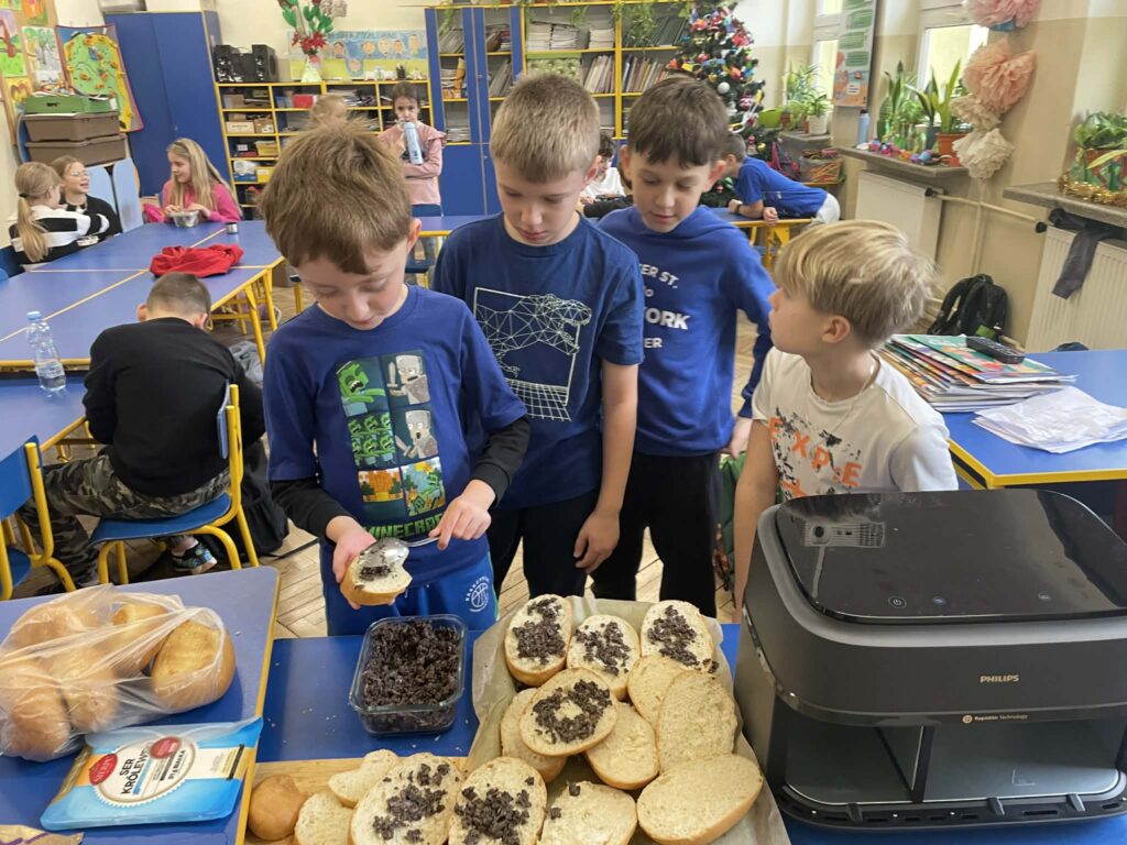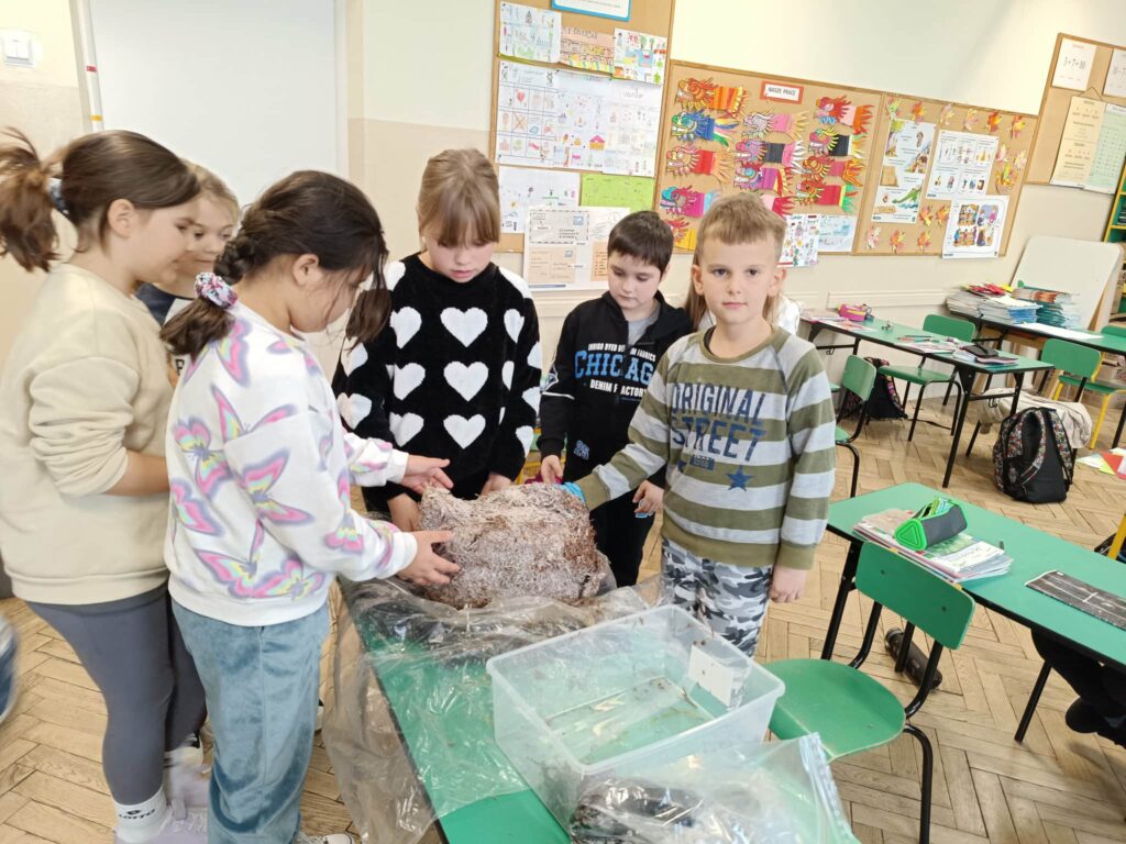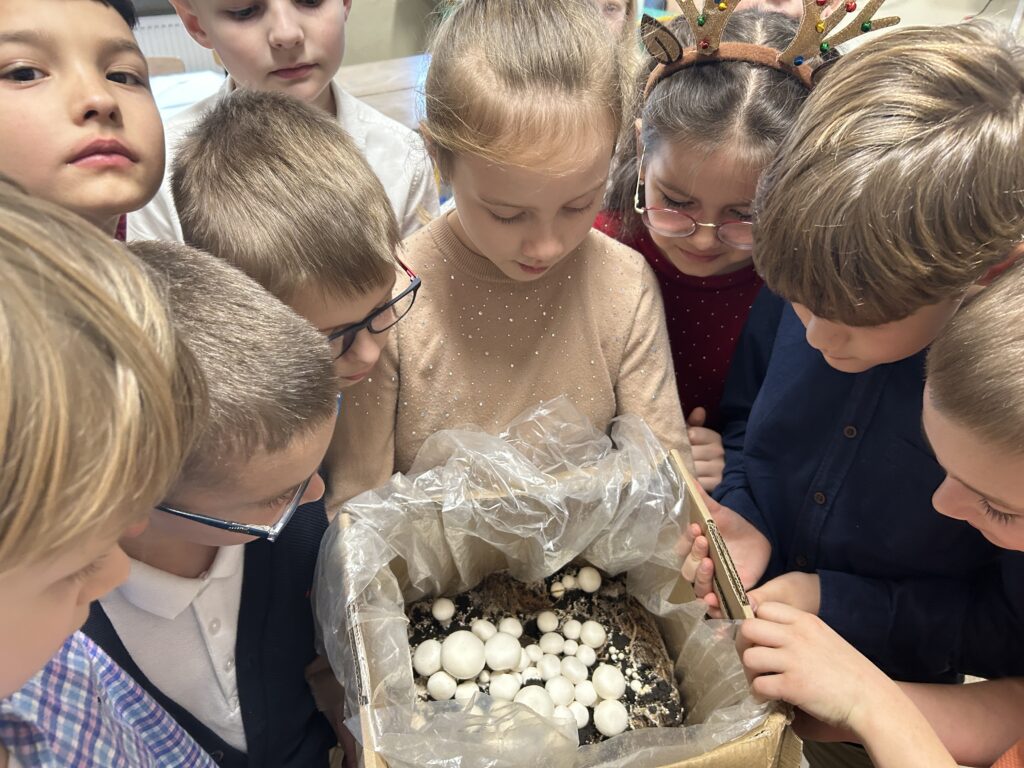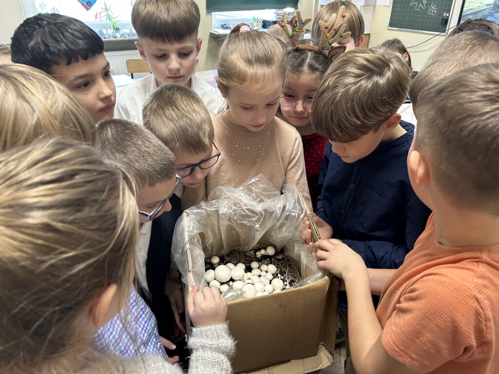 Uczniowie klas 2 i 3 wzięli udział w ogólnopolskim projekcie edukacyjnym „Pieczarki z klasą”, organizowanym przez firmę Agaris Myco Poland Sp. z o.o. Celem programu jest promowanie wśród dzieci i młodzieży wiedzy o pieczarkach oraz innych grzybach uprawnych, budowanie postaw ekologicznych, a także kształtowanie zdrowych nawyków żywieniowych. W ramach projektu uczniowie uprawiali pieczarki w swojej klasie, obserwując na bieżąco ich wzrost i rozwój. Dzięki zajęciom praktycznym mogli uczyć się poprzez zabawę i doświadczenie. Poznali cykl życia pieczarek oraz dowiedzieli się, jakie warunki są niezbędne do ich prawidłowej uprawy. Wspólna hodowla była doskonałą okazją do nauki odpowiedzialności, systematyczności i współpracy. Zwieńczeniem projektu było przygotowanie pysznych zapiekanek z własnoręcznie wyhodowanych pieczarek. Była to nie tylko smaczna nagroda za zaangażowanie, ale również praktyczna lekcja zdrowego odżywiania.