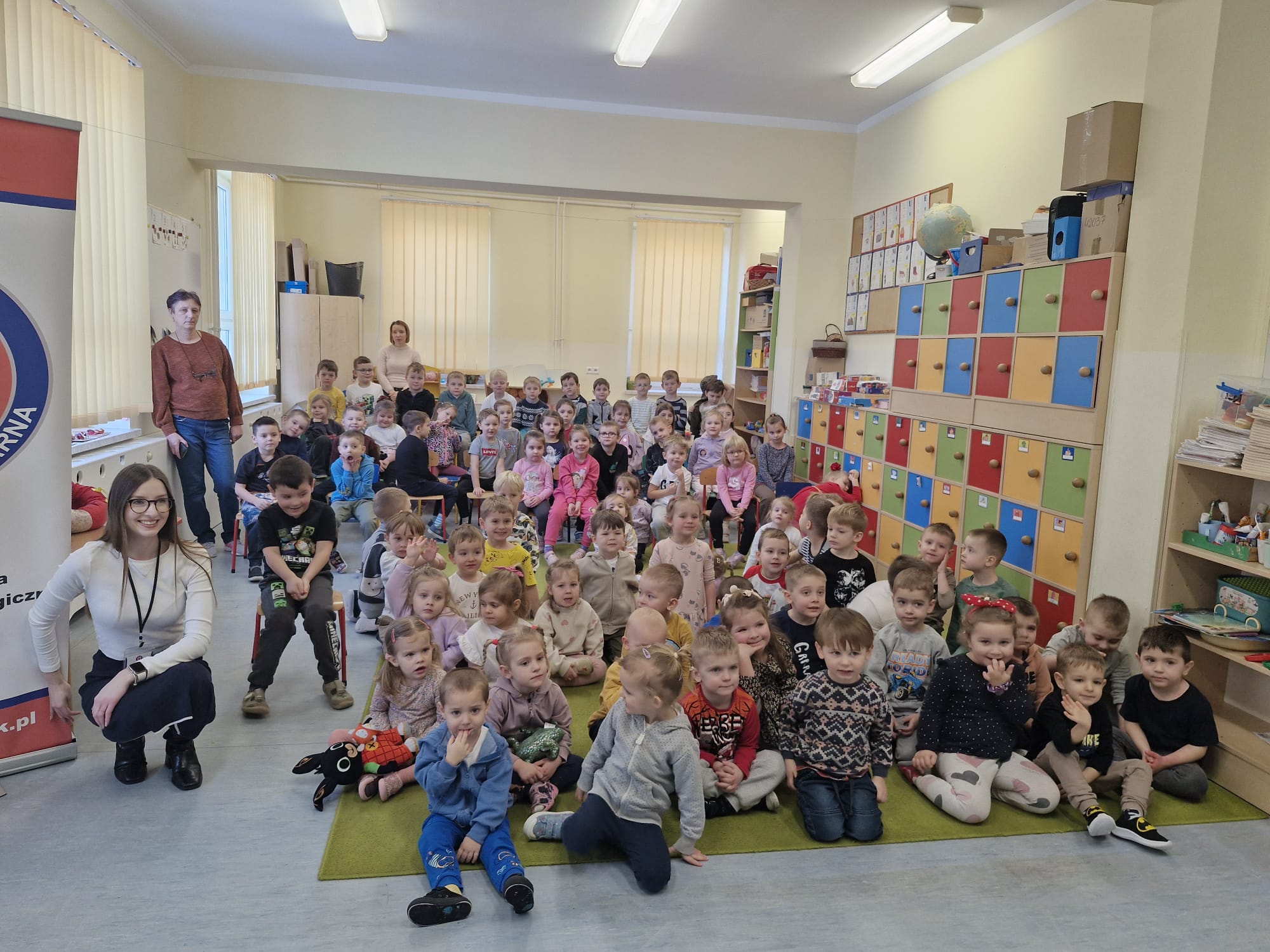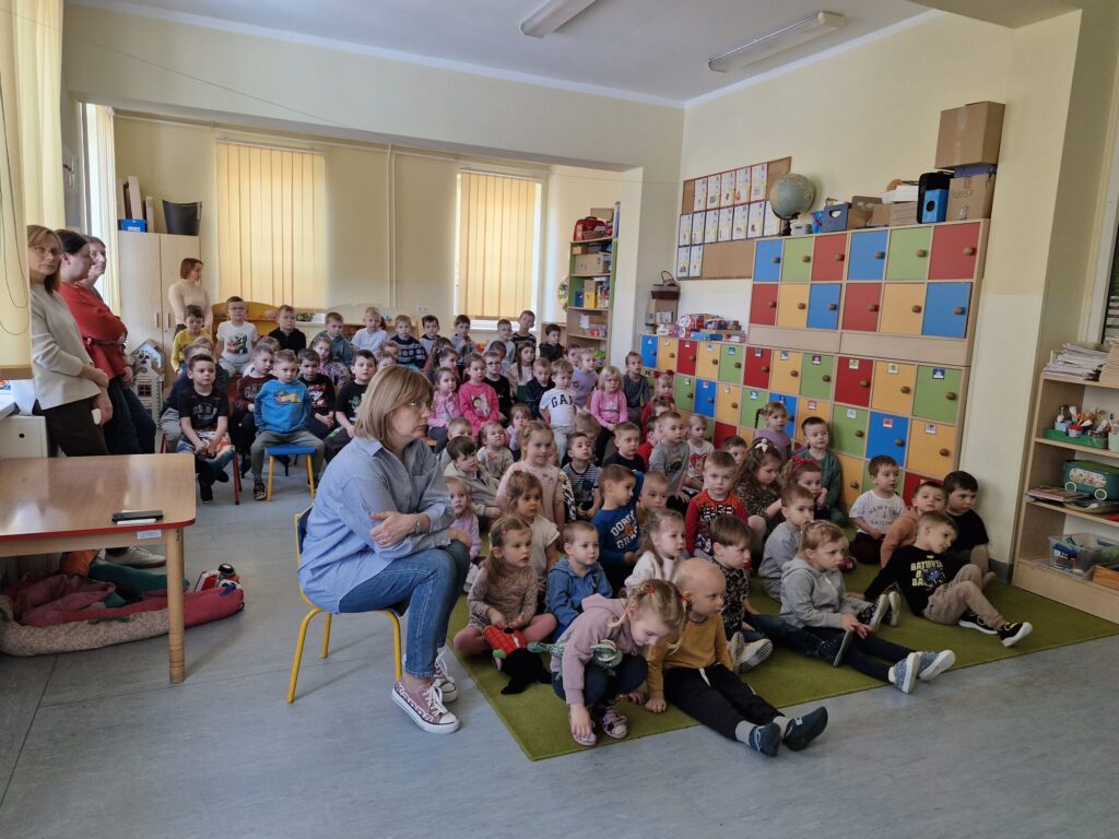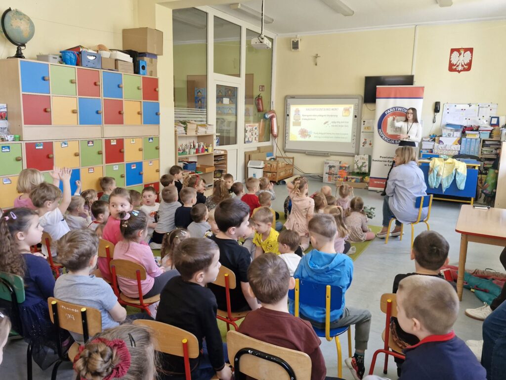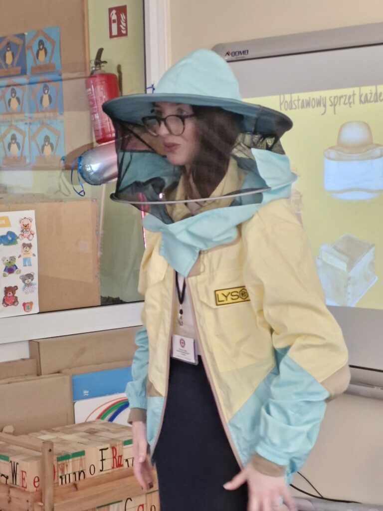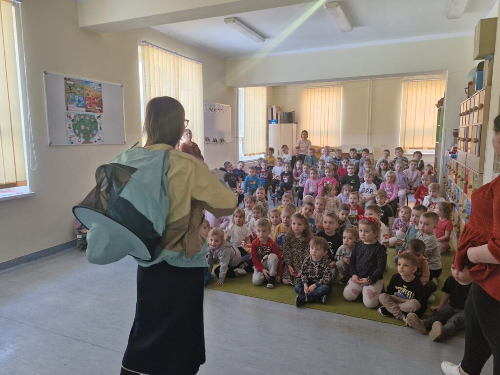 W ramach programu ekologicznego „Skąd się biorą produkty ekologiczne” w dniu 28 stycznia w przedszkolu odbyło się spotkanie z pracownikiem Powiatowej Stacji Sanitarno- Epidemiologicznej w Leżajsku, panią Gabrielą Czerwonką, pt. „Pszczoły i miód – niezwykły świat natury”. Za pomocą prezentacji multimedialnej pani Gabriela zapoznała dzieci z życiem pszczół, wyjaśniła, skąd bierze się miód oraz jak przebiega proces jego powstawania. Przedszkolaki poznały także różne rodzaje miodów oraz dowiedziały się, na czym polega praca pszczelarza i jak wygląda jego strój ochronny. Spotkanie było bardzo interesujące i dostosowane do wieku dzieci. Na zakończenie każde dziecko otrzymało obrazek do kolorowania związany z tematyką pszczół.