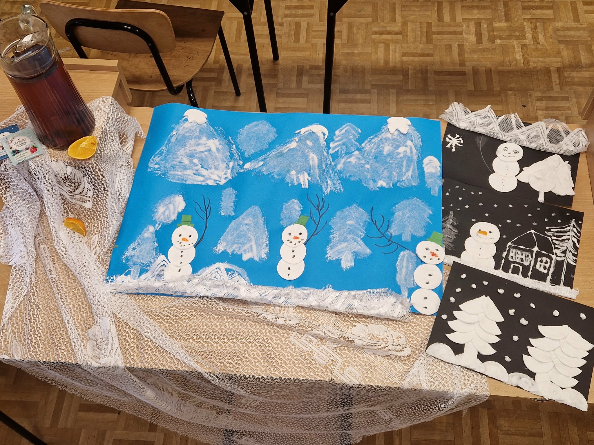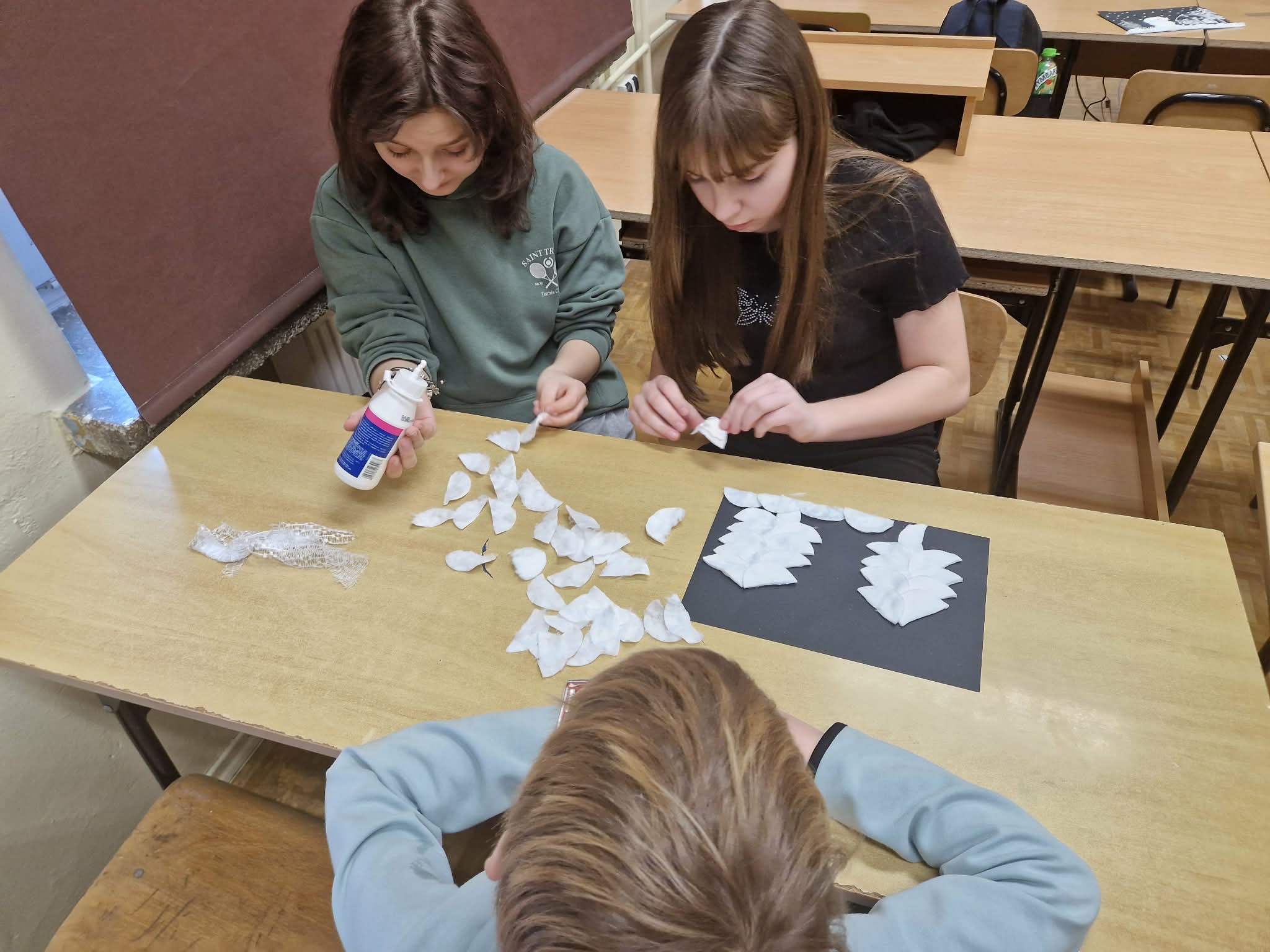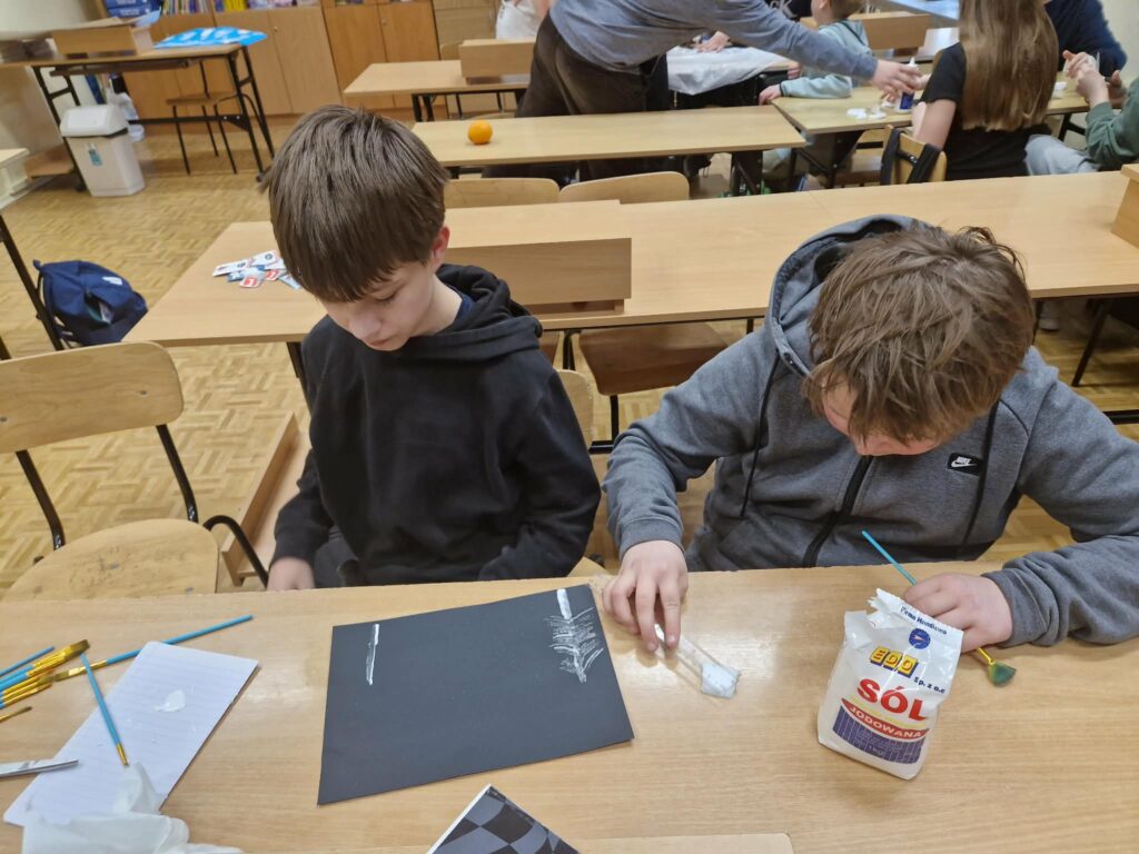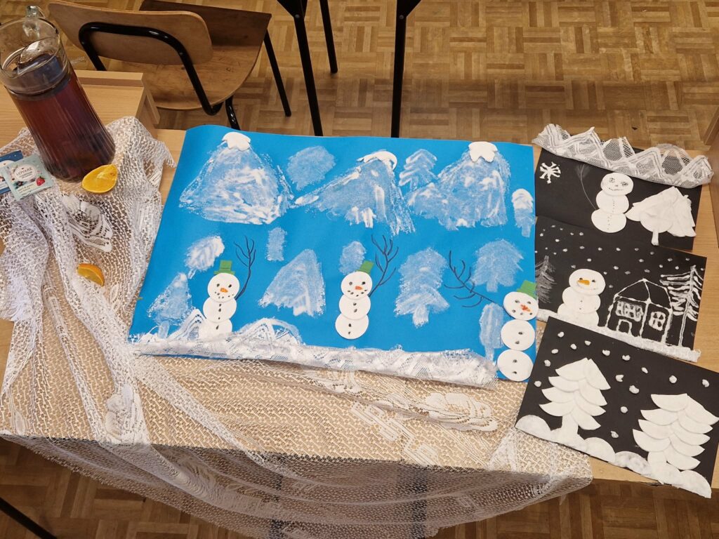 W ramach ogólnopolskiego projektu „Rok Dziecięcej Kreatywności – Interdyscyplinarne Warsztaty dla Uczniów z SPE”, uczniowie przystąpili do realizacji drugiego zadania pod hasłem „Zimowa opowieść”. Zadanie polegało na wykonaniu pracy plastycznej przedstawiającej zimowy pejzaż z wykorzystaniem soli kuchennej, płatków kosmetycznych oraz kawałków firanek. Powstały ośnieżone drzewa i bałwanki, a efekt końcowy stanowił rezultat zaangażowania oraz współpracy uczestników.