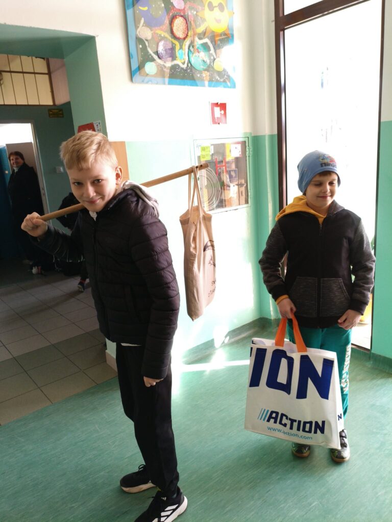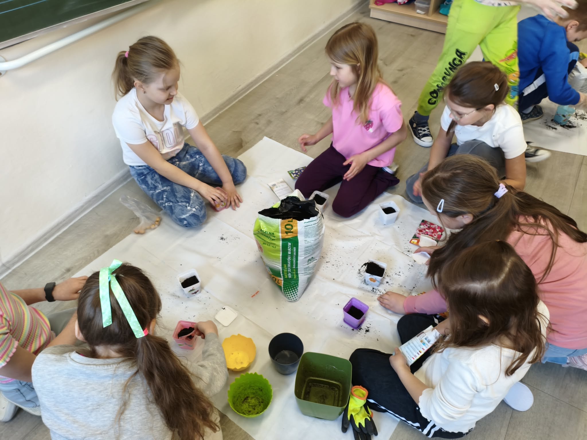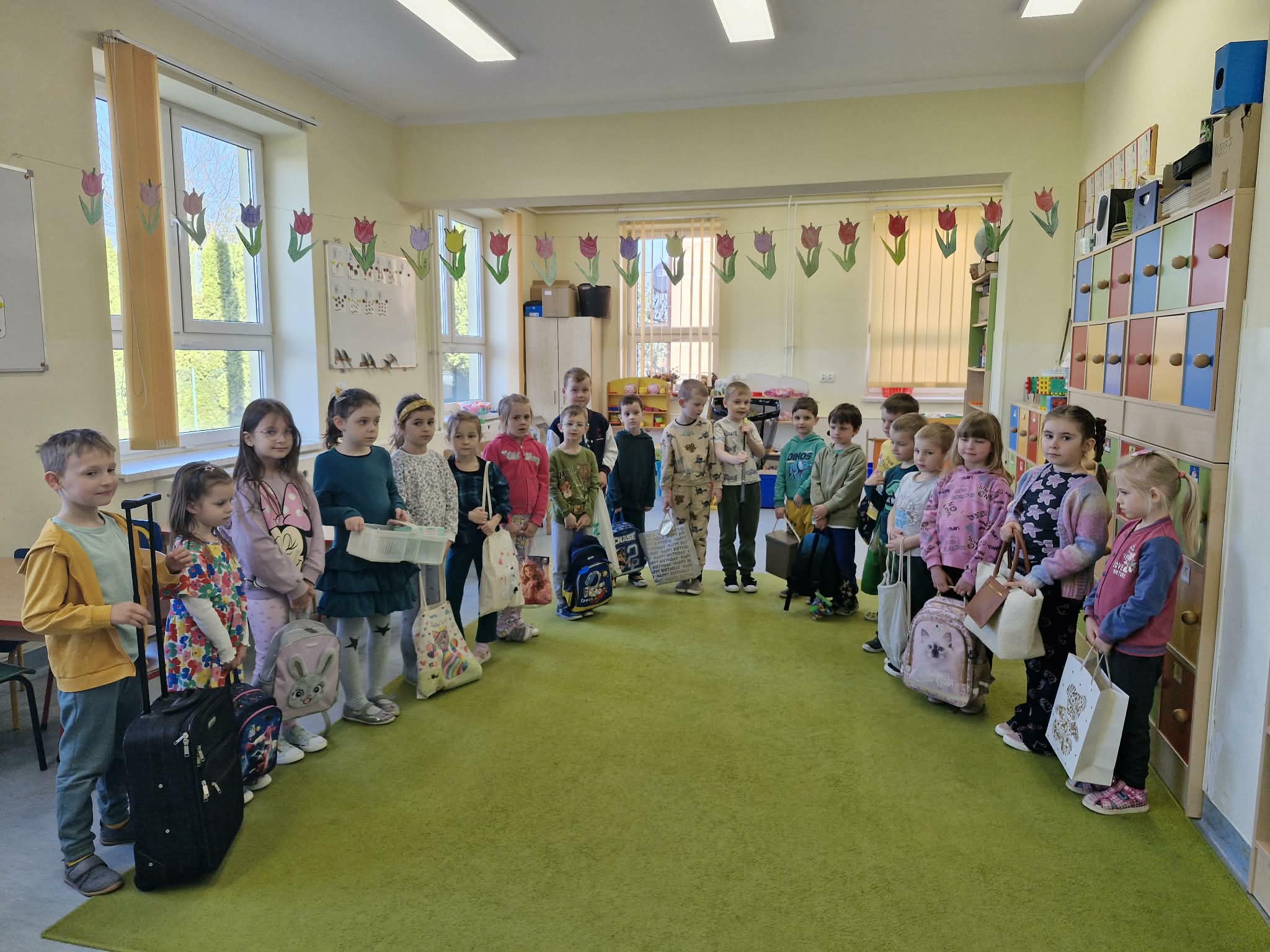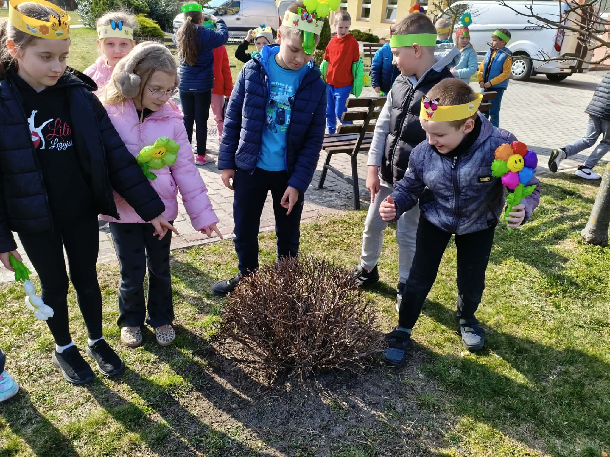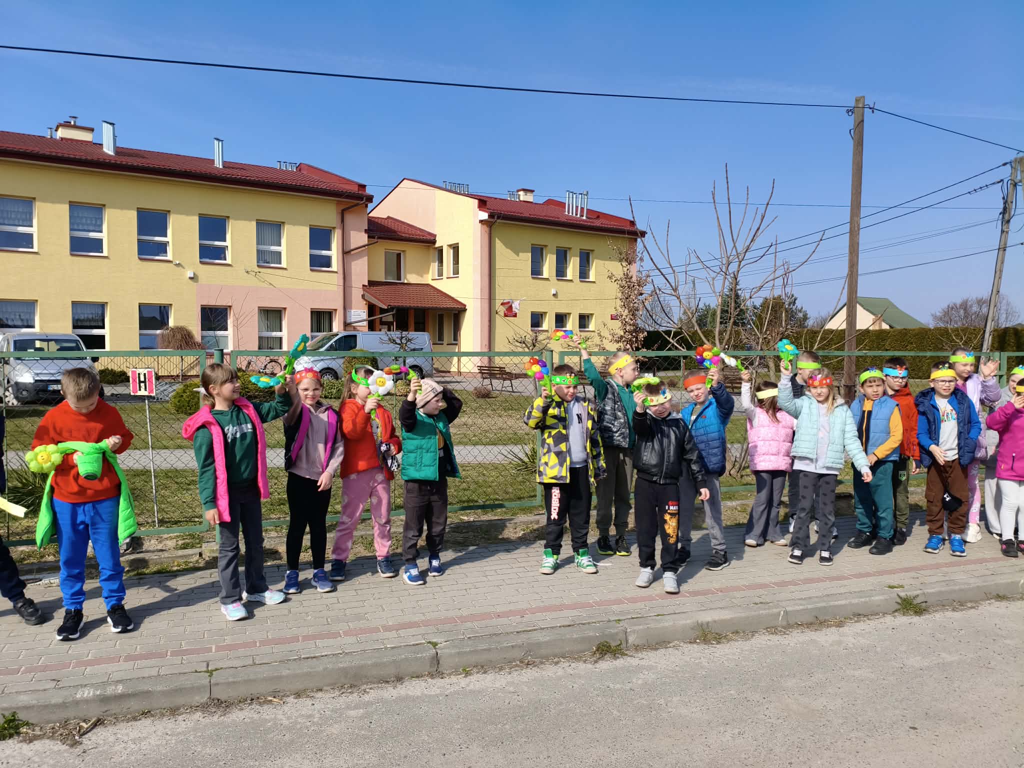 Pierwszy dzień wiosny w przedszkolu i klasach 1–3 był pełen radości, kolorów i ciekawych aktywności. Jednym z najważniejszych punktów dnia było sadzenie roślin. Dzieci z wielkim zaangażowaniem sadziły przygotowane wcześniej sadzonki. Każdy mógł poczuć się jak mały ogrodnik. Kolejnym elementem obchodów był wiosenny spacer z kolorowymi balonami w kształcie kwiatów. Uczniowie wyruszyli na poszukiwanie pierwszych oznak wiosny. Z ogromnym zainteresowaniem obserwowali budzącą się do życia przyrodę – wypatrywali pąków na drzewach, śpiewających ptaków oraz pierwszych kwiatów. Spacer był okazją do ruchu na świeżym powietrzu i rozwijania umiejętności uważnej obserwacji. Nie zabrakło także działań artystycznych. Dzieci wykonały różne prace wiosenne, kolorowe opaski, które ozdobiły motywami wiosennymi. W szkole odbyła się również akcja „Dzień bez plecaka – wrzuć piątaka”. Uczniowie wykazali się pomysłowością, przynosząc swoje książki i przybory w nietypowych „zastępnikach” plecaków. Wydarzenie miało nie tylko humorystyczny charakter, ale także wymiar społeczny – zebrane środki zostały przeznaczone na konkurs „Talentowisko”.