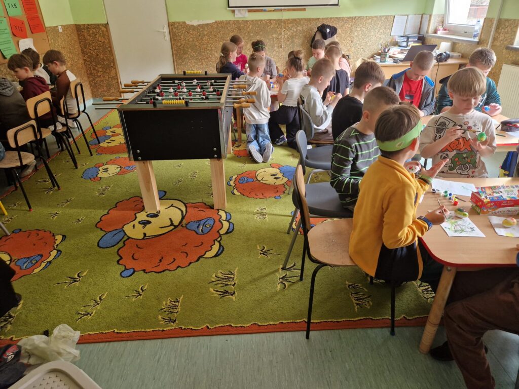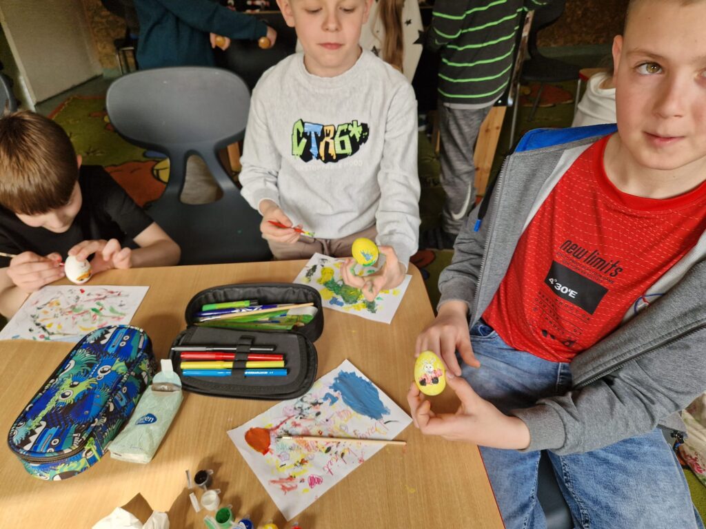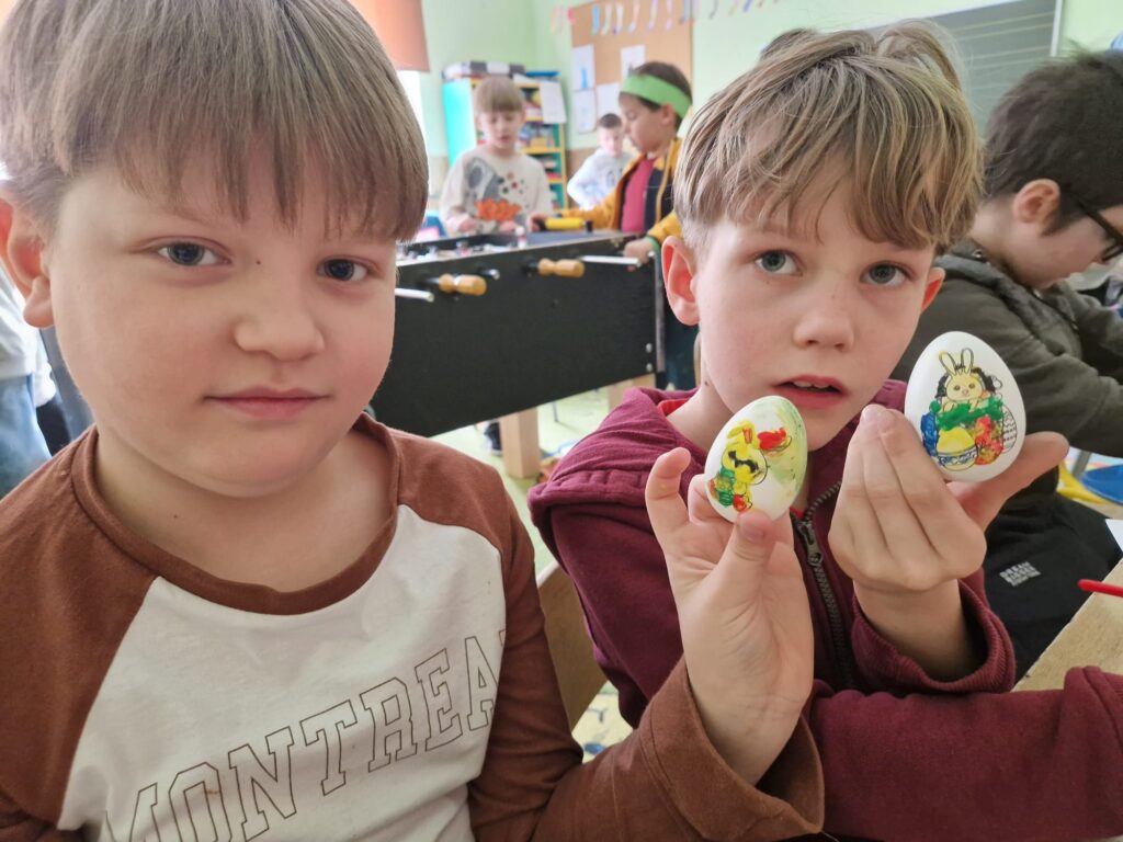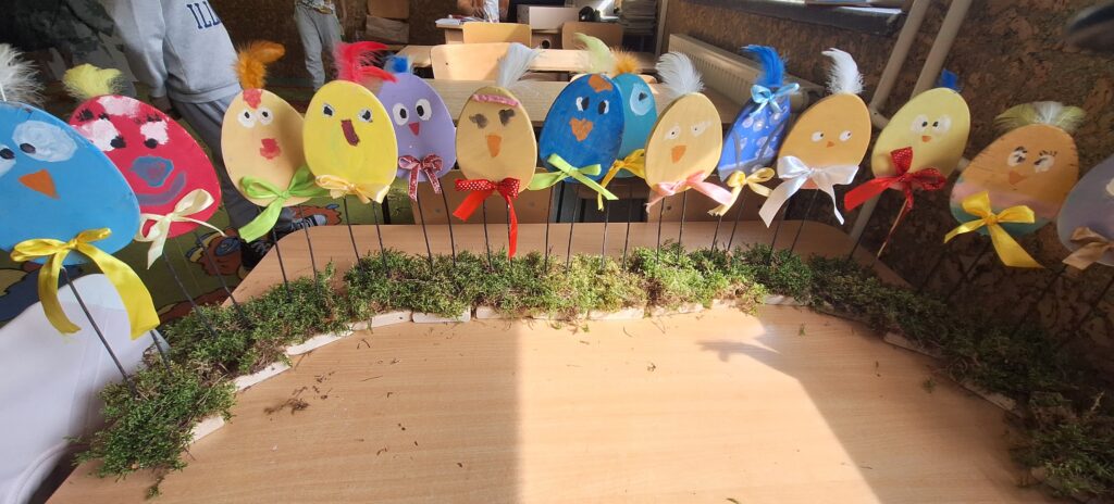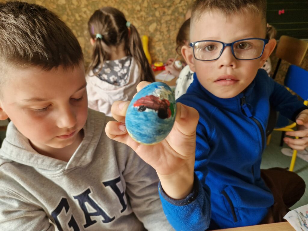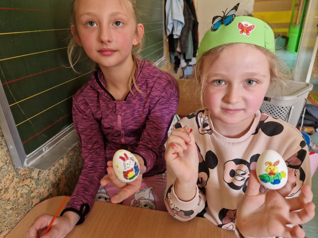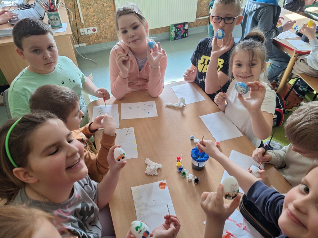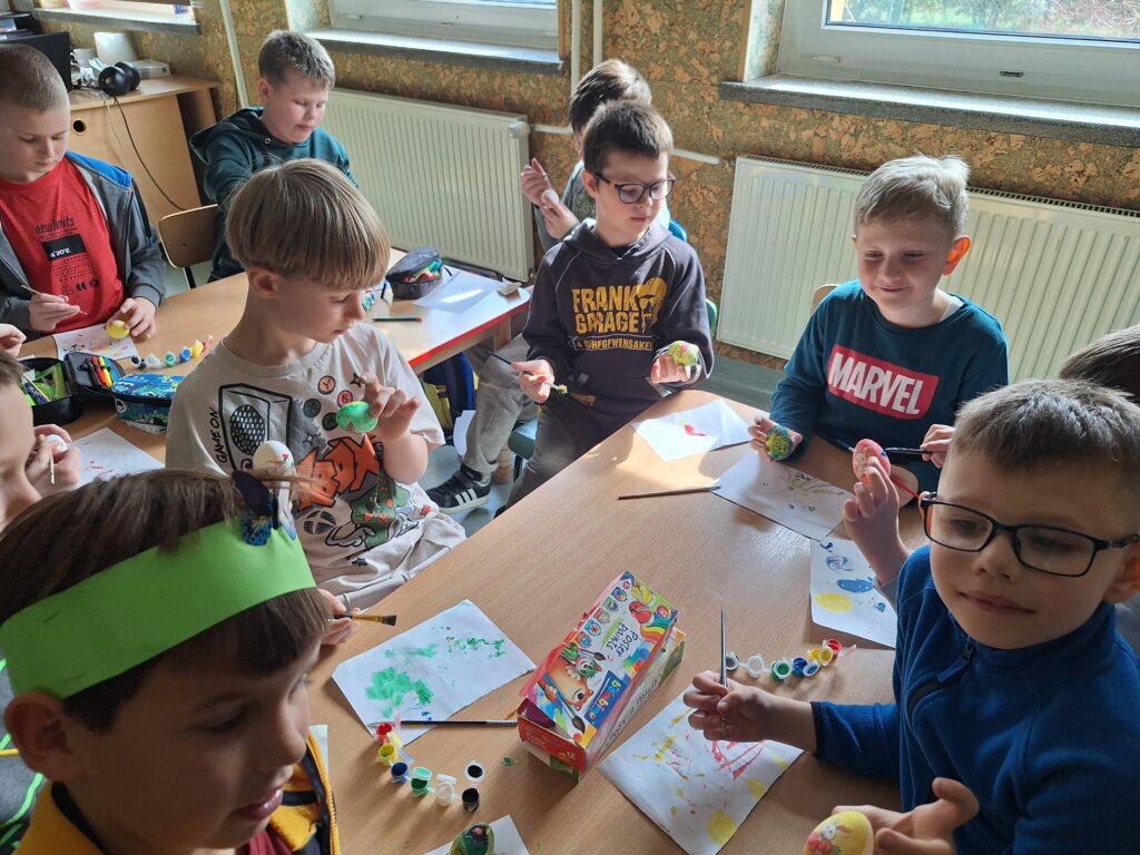 W ostatnim tygodniu przed świętami Wielkanocnymi uczniowie świetlicy szkolnej uczestniczyli w zajęciach plastycznych o tematyce wielkanocnej. Uczniowie malowali pisanki wielkanocne, samodzielnie dobierając kolory i wzory, dzięki czemu każda z nich była niepowtarzalna. Podczas kolejnych zajęć wykonali wielkanocne kurczaczki, kolorowe ozdoby, które pięknie wpisują się w świąteczny wystrój. Zajęcia były okazją do kultywowania rodzimych tradycji, rozwijania kreatywności oraz zdolności manualnych. Każdy uczestnik zabrał do domu własnoręcznie wykonane prace.