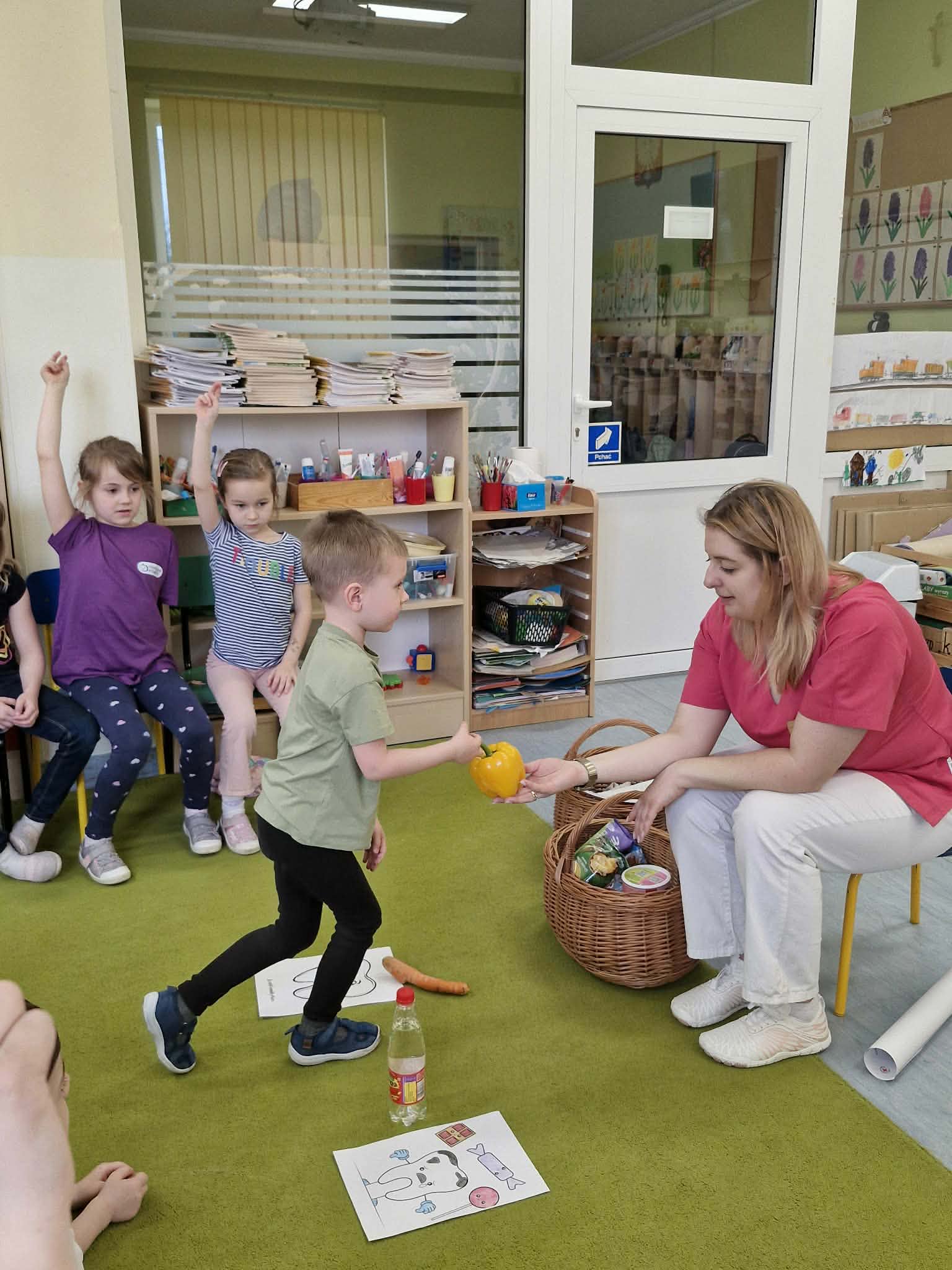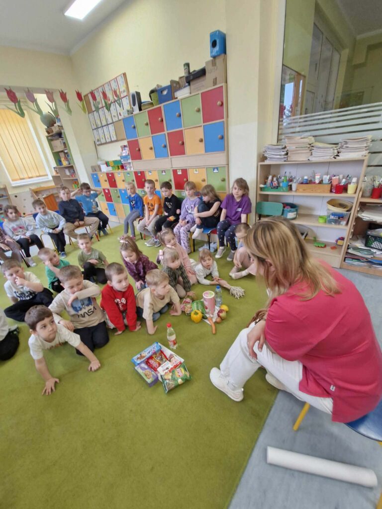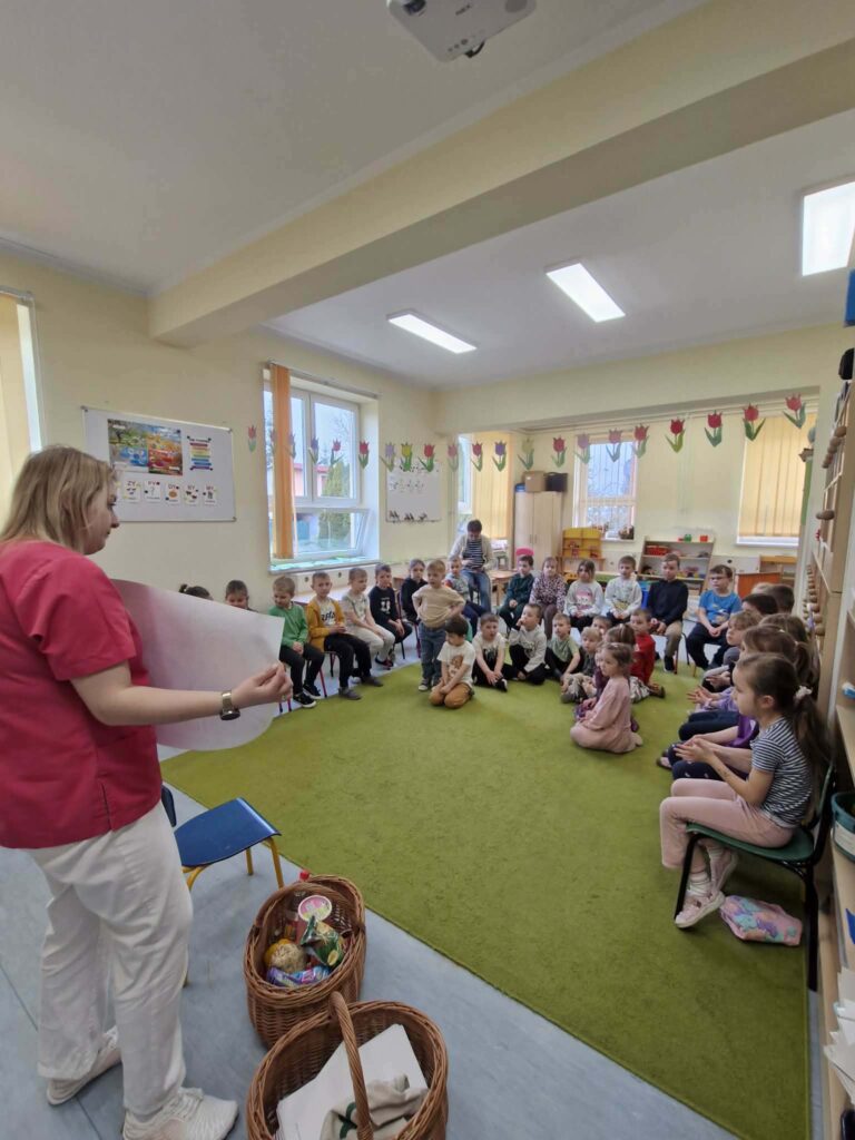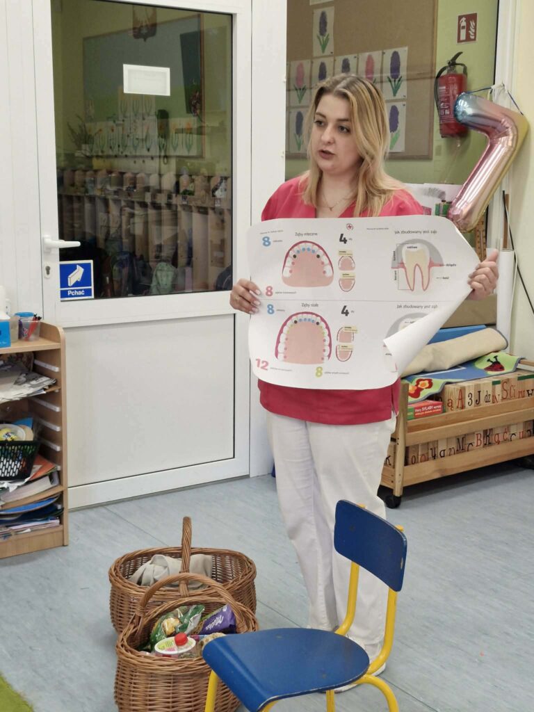 W przedszkolu odbyła się wizyta higienistki stomatologicznej, która w ciekawy i przystępny sposób przybliżyła dzieciom zasady dbania o higienę jamy ustnej. Przedszkolaki dowiedziały się, jak prawidłowo szczotkować zęby, jak często należy to robić oraz dlaczego jest to tak ważne dla zdrowia. Podczas spotkania dzieci poznały również czynniki, które negatywnie wpływają na stan zębów, takie jak nadmiar słodyczy czy brak regularnej higieny. Higienistka zaprezentowała także różne przedmioty służące do dbania o zęby, m.in. szczoteczkę, pastę i nić dentystyczną, wyjaśniając ich zastosowanie. Spotkanie było bardzo interesujące i angażujące dla dzieci, które chętnie uczestniczyły w rozmowie i zadawały pytania. Na zakończenie każde dziecko otrzymało naklejkę, co sprawiło im dużo radości i było miłym podsumowaniem wizyty.