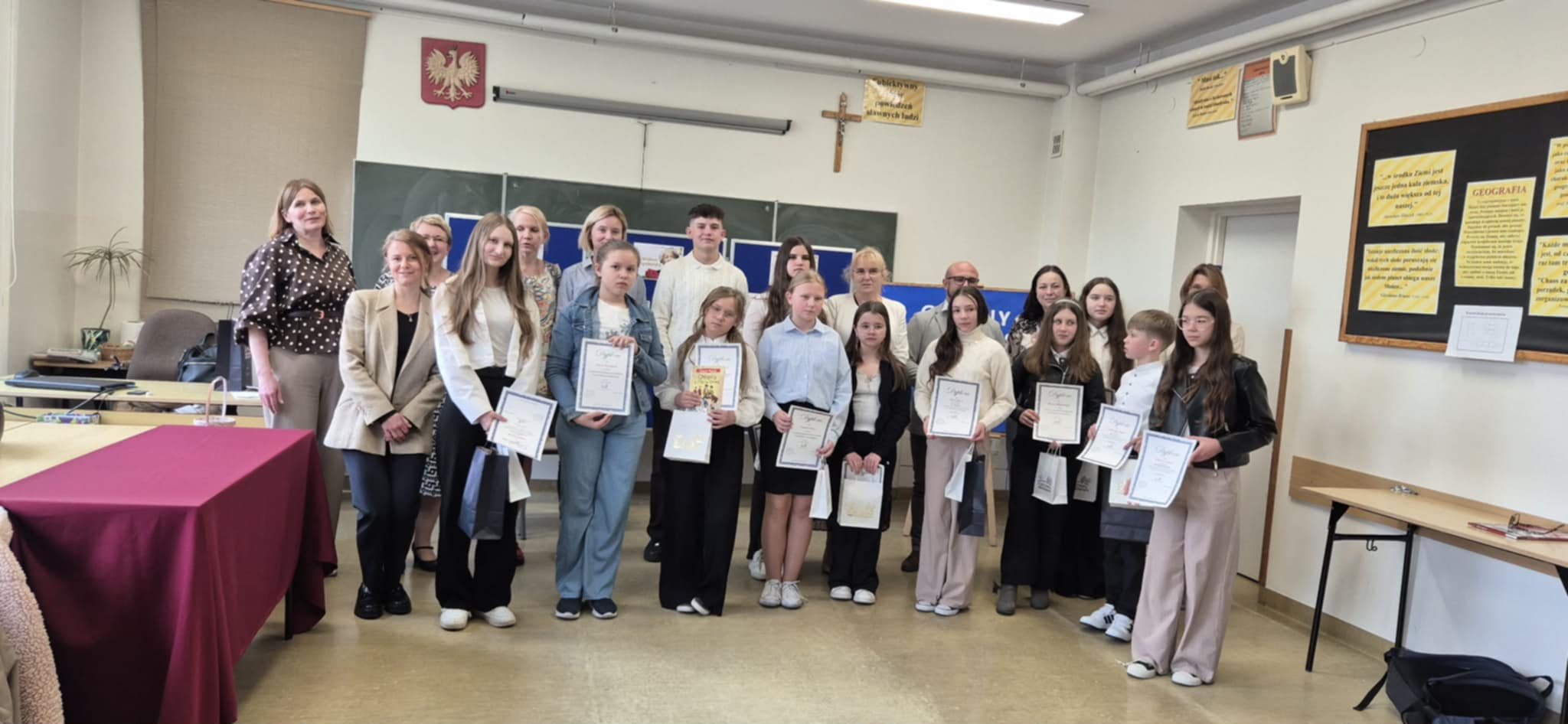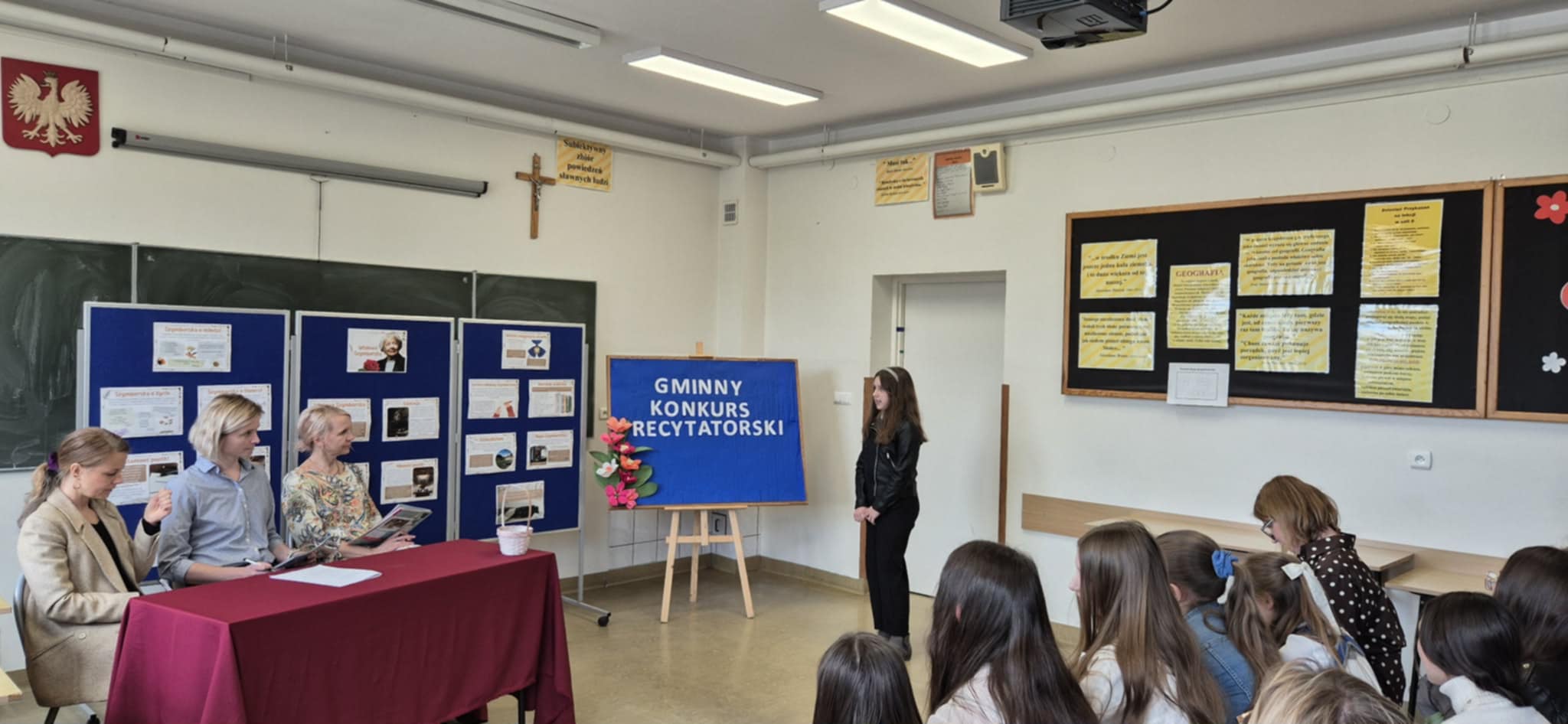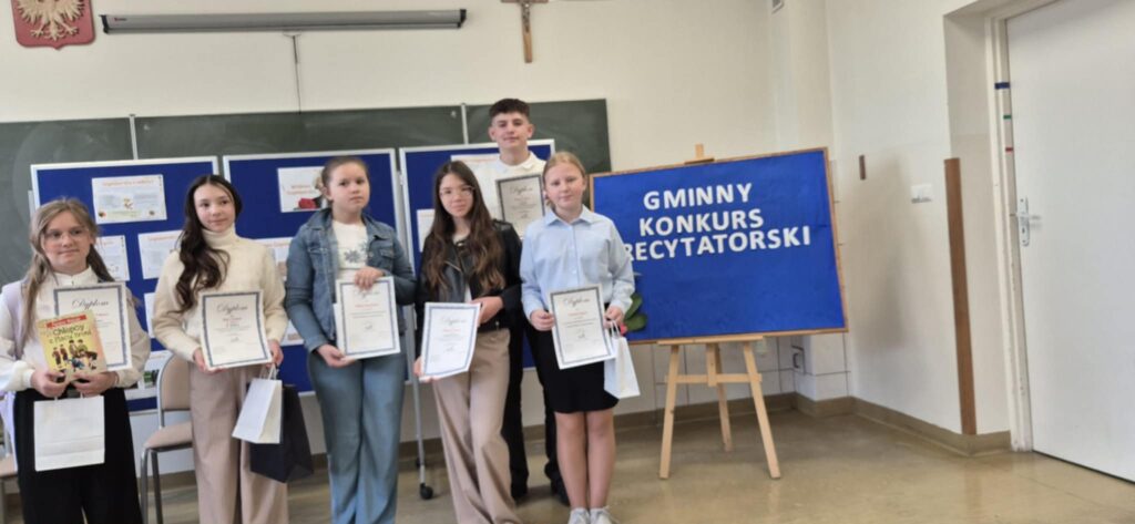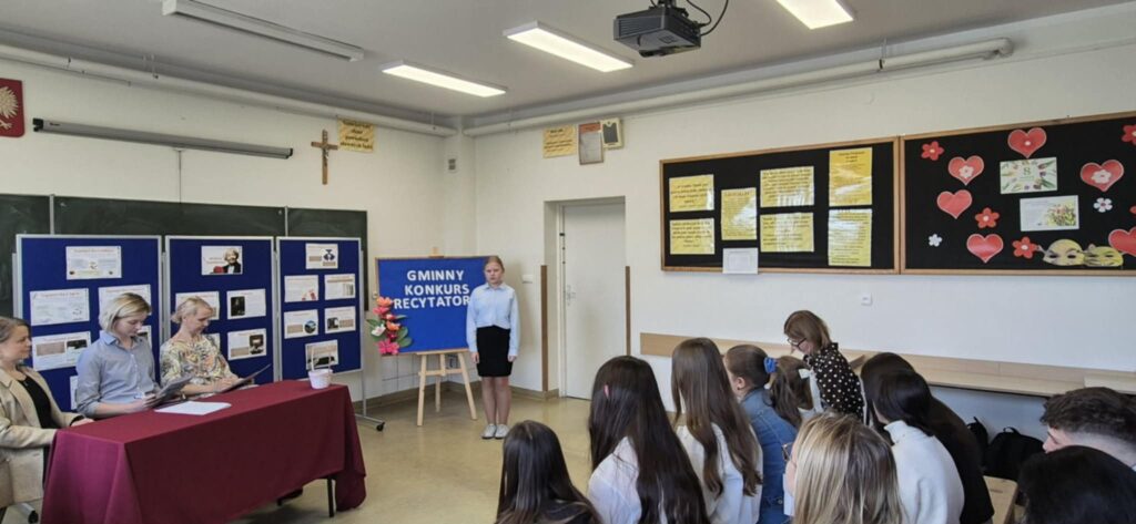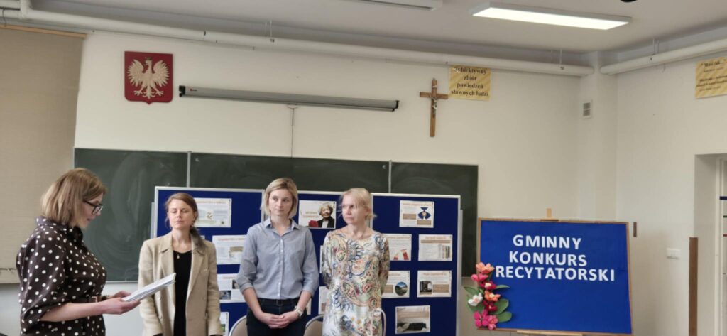 24.04. br. w naszej szkole odbył się Gminny Konkurs Recytatorski Poezji Wisławy Szymborskiej pt. „Słowa, które zadziwiają świat”. Wydarzenie zostało zorganizowane z okazji zbliżającej się 30. rocznicy przyznania poetce Nagrody Nobla, co nadało mu szczególny, jubileuszowy charakter. Patronat nad konkursem objęła Pani Wójt Gminy Kuryłówka, Agnieszka Wyszyńska. Oceny recytacji dokonała komisja konkursowa w składzie: p. Agata Giełczyńska–Jonik, p. Alicja Skiba, p. Magdalena Podobińska. Wszyscy uczestnicy, uczniowie szkół z terenu gminy Kuryłówka, zaprezentowali wysoki poziom artystyczny, a jury nie kryło swojego uznania – komisja była pod ogromnym wrażeniem wrażliwości interpretacyjnej, dojrzałości oraz zaangażowania młodych recytatorów.