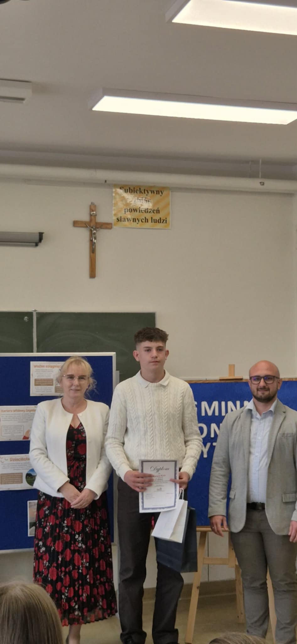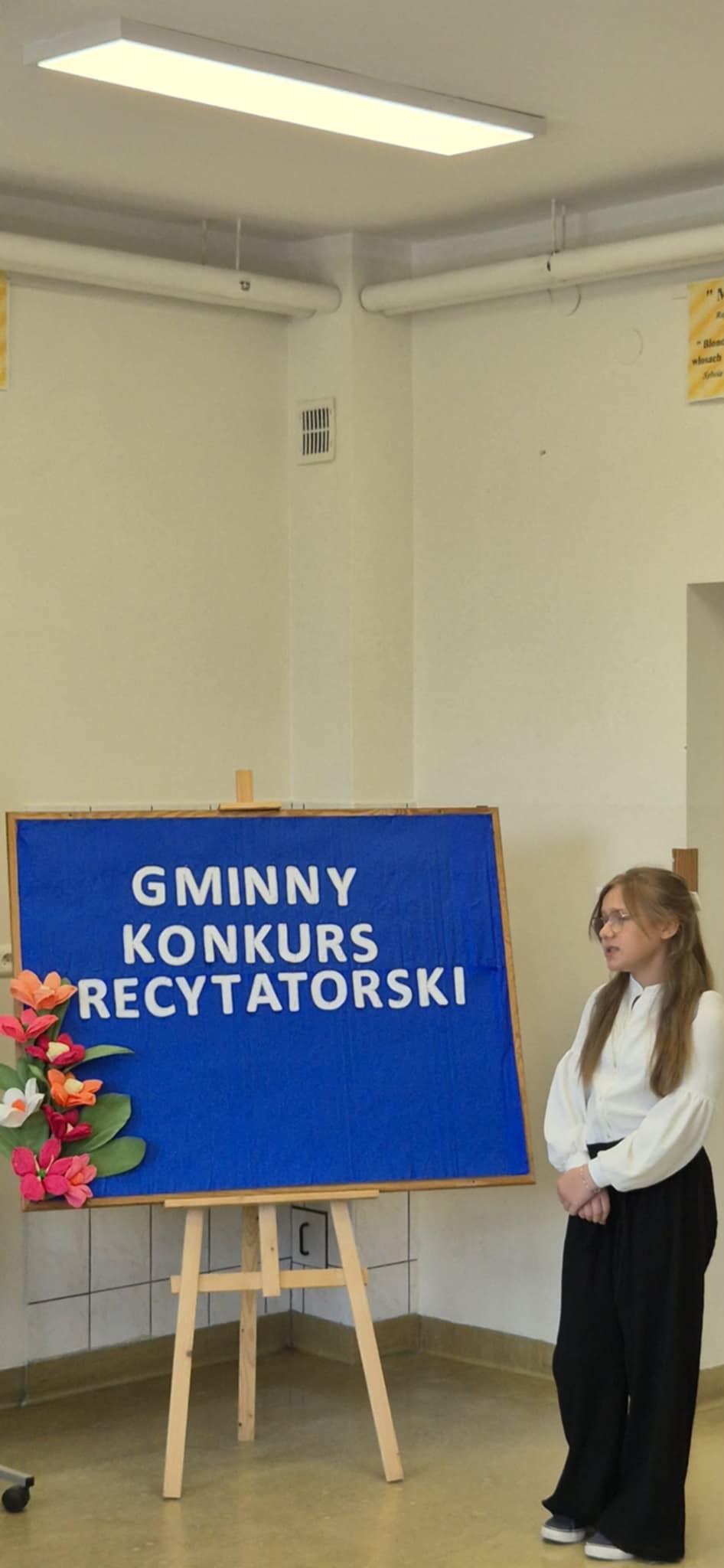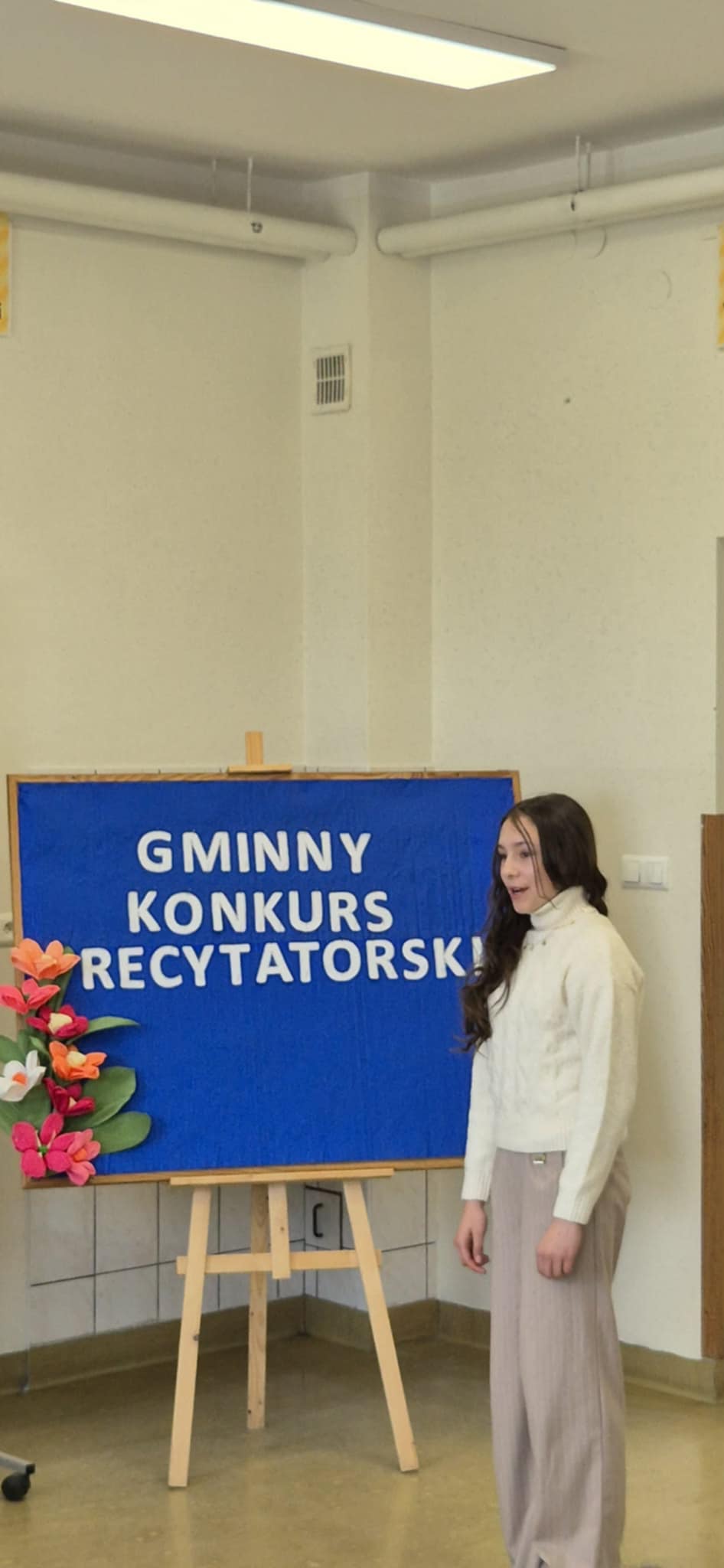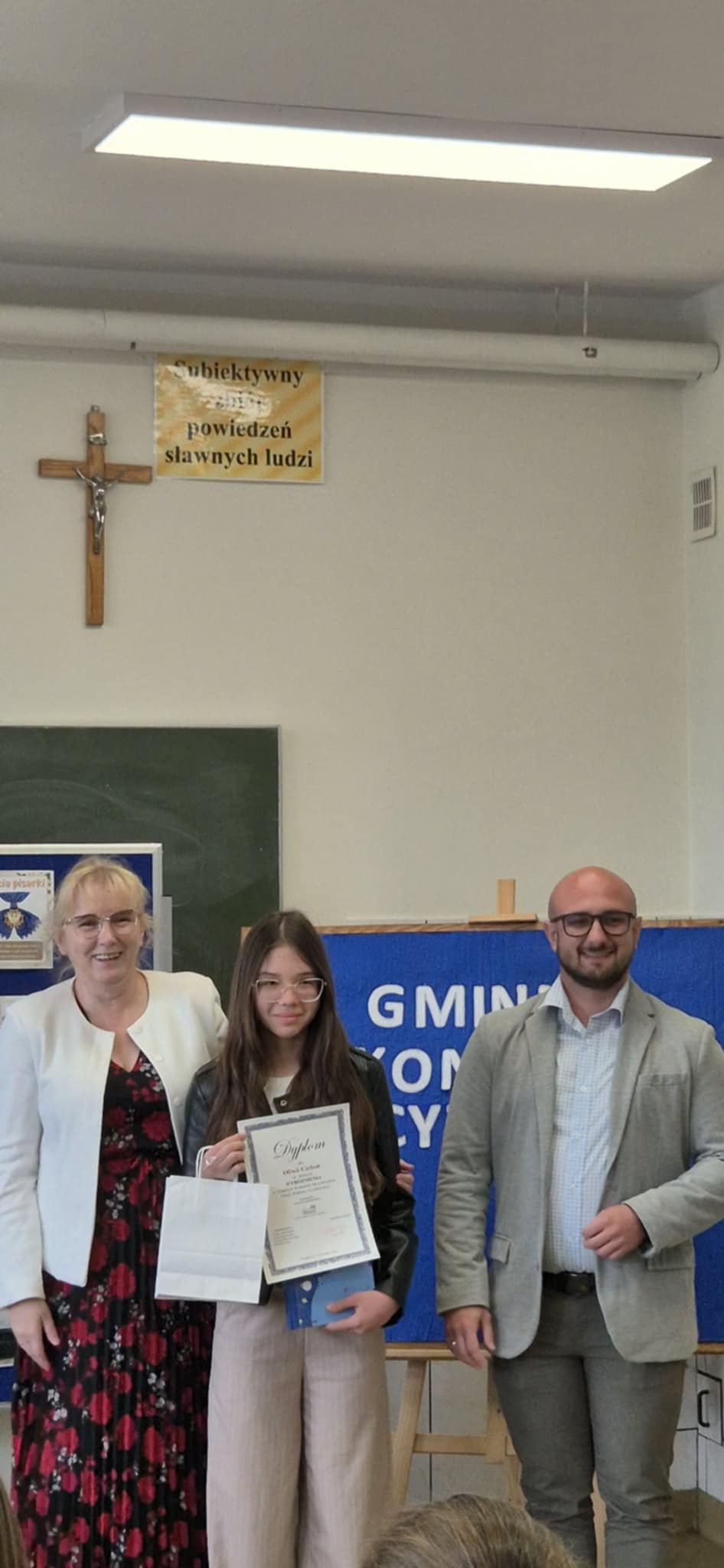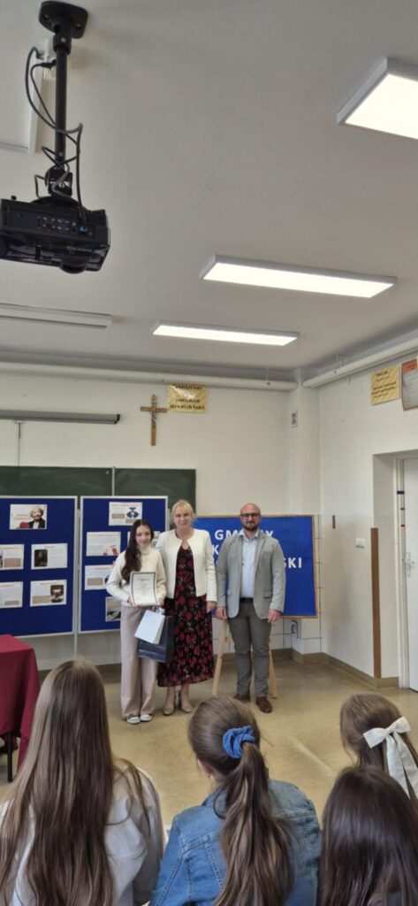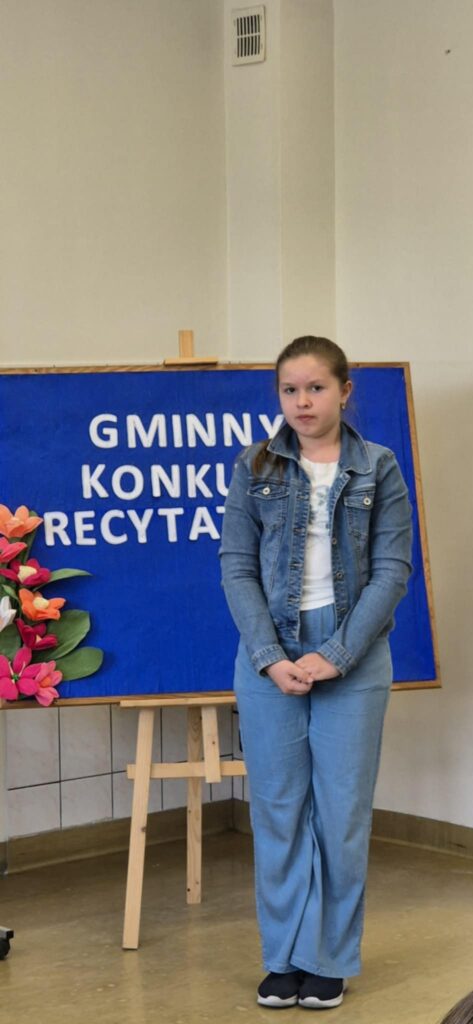 Zwieńczeniem wydarzenia było uroczyste wręczenie nagród i dyplomów przez Panią dyrektor szkoły, Janinę Paję oraz Pana sekretarza Urzędu Gminy – Łukasza Deca. Podczas podsumowania konkursu złożyli oni wszystkim uczestnikom serdeczne gratulacje, wyrażając słowa podziwu dla ich talentu i odwagi scenicznej. Serdeczne podziękowania kierujemy do Pani Wójt za ufundowanie nagród oraz