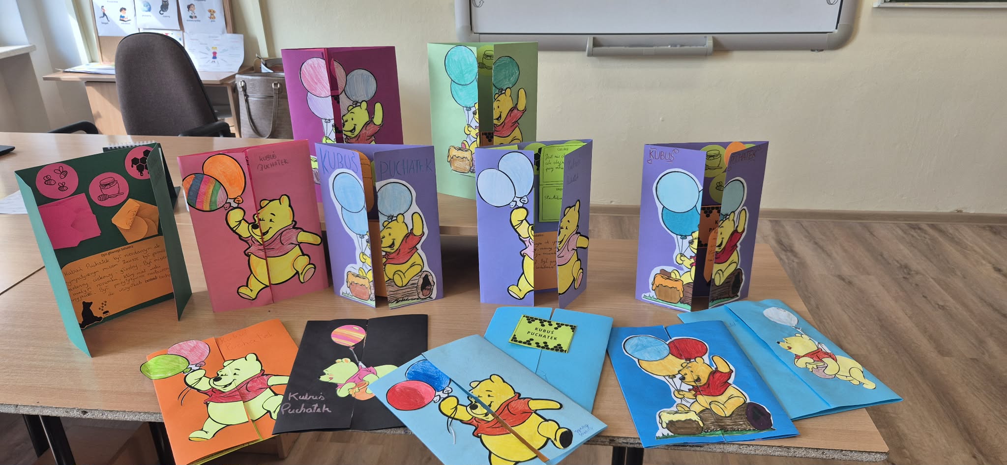 Podczas lekcji uczniowie klasy 4b wykonali lapbook związany z przygodami Kubusia Puchatka oraz stworzyli własne projekty Stumilowego Lasu. Pracując w grupach, rozwijali kreatywność i współpracę, a także utrwalali znajomość bohaterów i wydarzeń z lektury. Dzięki temu lepiej zrozumieli wartości takie jak przyjaźń, pomoc i życzliwość, które są ważnym elementem świata Kubusia Puchatka.