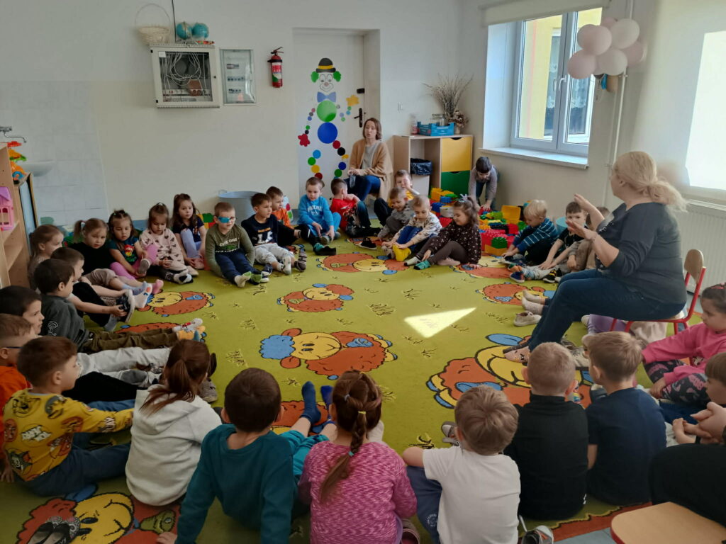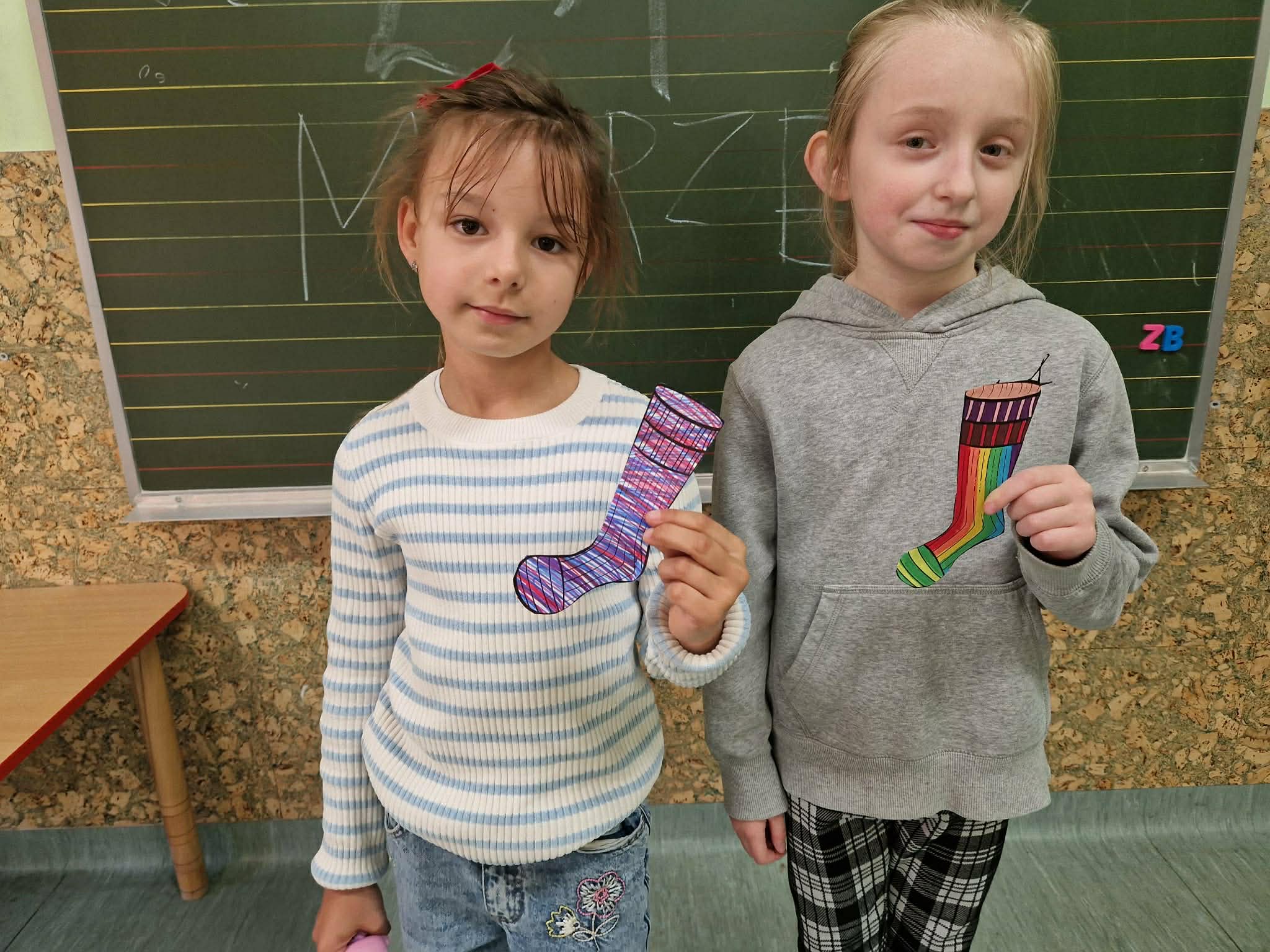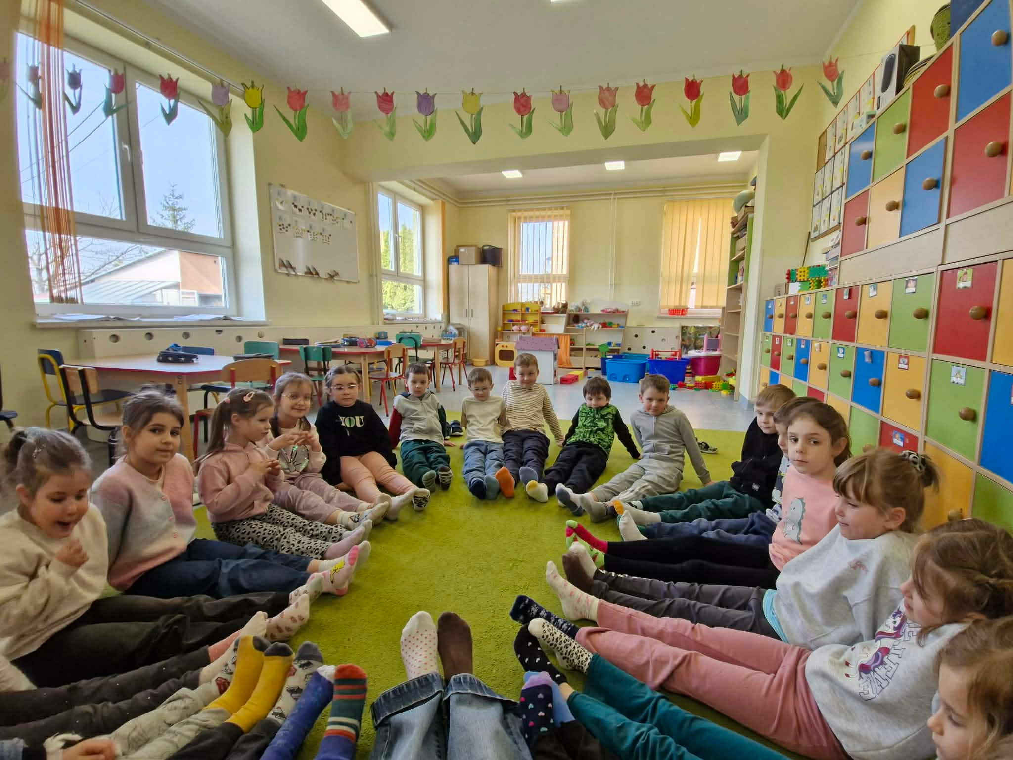 Z okazji IV Ogólnopolskiego Happeningu „Przywitaj wiosnę w kolorowych skarpetkach” oraz Światowego Dnia Osób z Zespołem Downa w oddziałach przedszkolnych odbyły się ciekawe pogadanki. Dzieci dowiedziały się, dlaczego tego dnia zakładamy skarpetki nie do pary, co symbolizują oraz w jaki sposób wyrażamy solidarność z osobami z Zespołem Downa. Przedszkolaki obejrzały krótką bajkę o „Kolorowych skarpetkach”, a po omówieniu jej treści uczestniczyły w zabawach z ich wykorzystaniem. Na koniec wykonały kolorowe skarpetki aby również w ten sposób wyrazić akceptację i szacunek dla różnorodności.