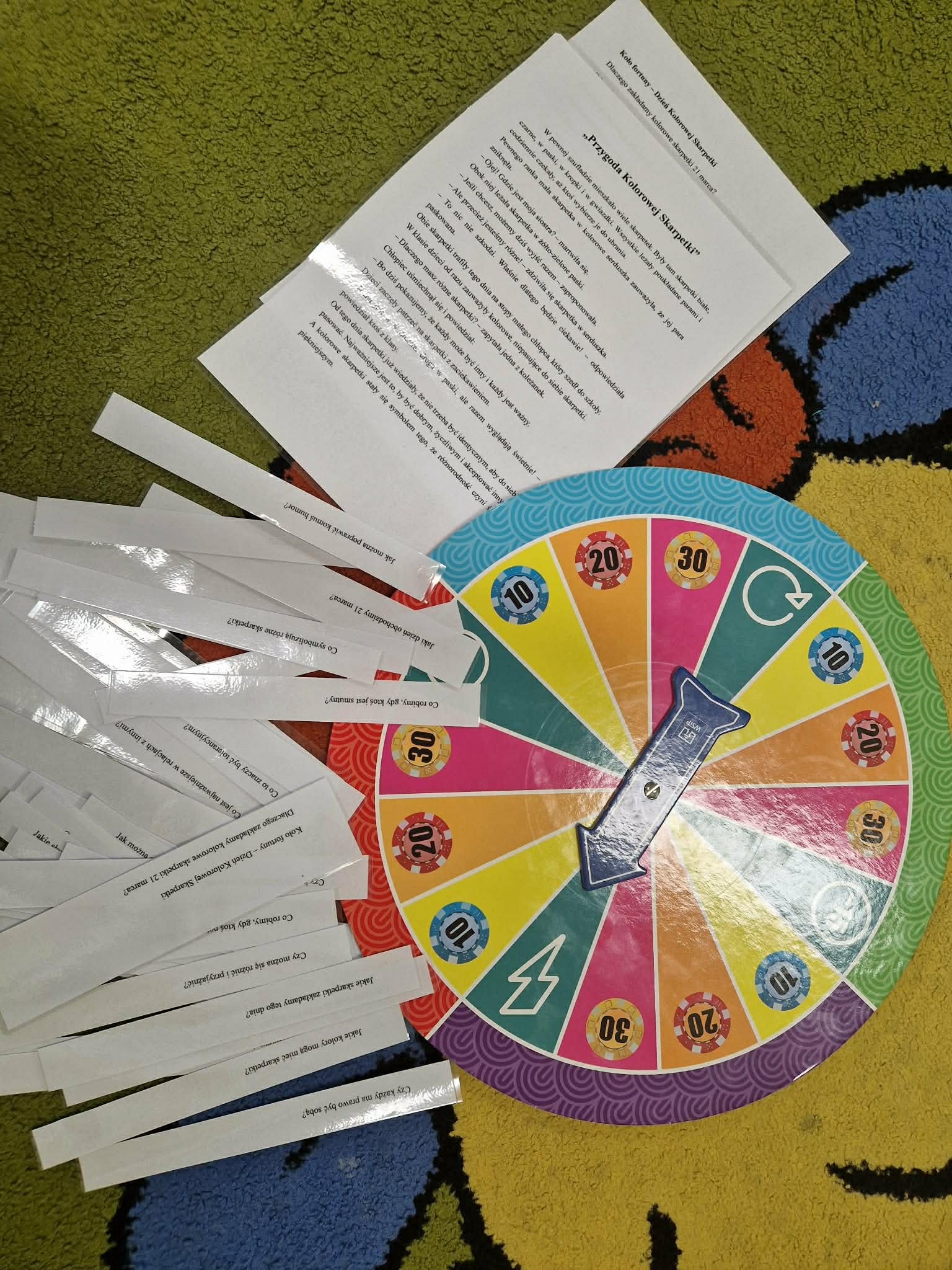 Świetlica również włączyła się w obchody tego wyjątkowego dnia. Uczniowie rozpoczęli zajęcia od kolorowania skarpetek, które następnie wspólnie rozwiesili na sznureczku, tworząc kolorową dekorację. Podczas zajęć wysłuchano opowiadania ,,Przygoda kolorowej skarpetki’’ nawiązującego do tematu różnorodności. Na zakończenie zdobytą wiedzę sprawdziło Koło Fortuny, przy którym uczniowie kręcili kołem i odpowiadali na pytania związane z obchodzonym świętem.